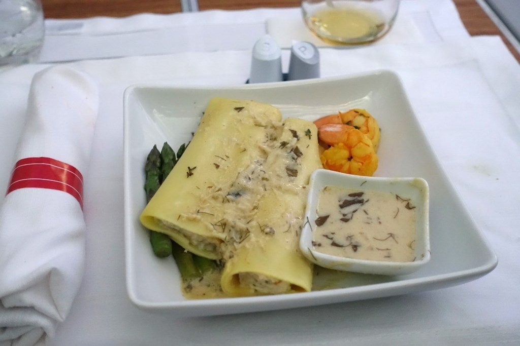 The business-class menu offers the same number of main-dish choices, though. Quality and portion size are comparable to first class.