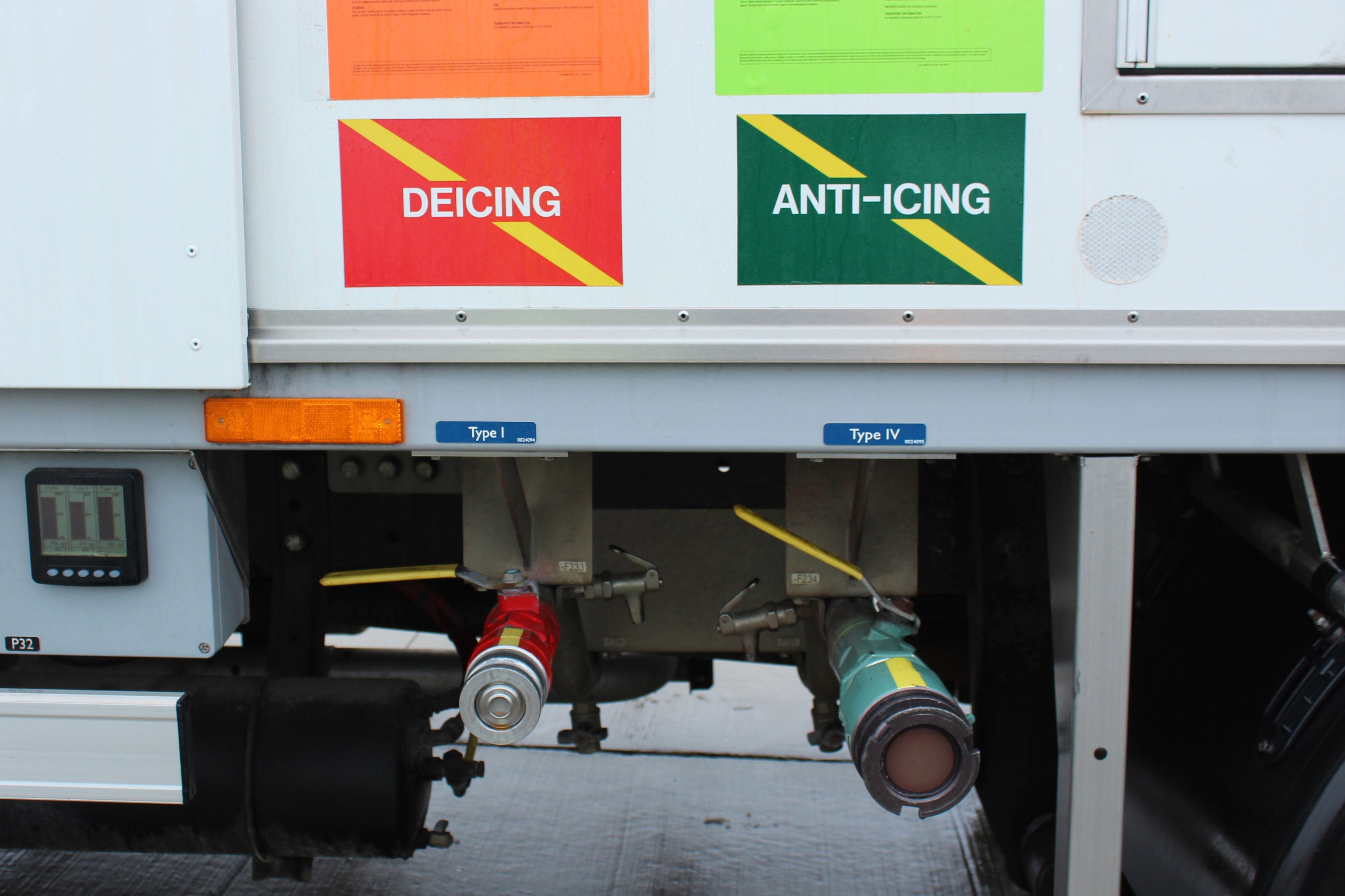 Two types of spray on one de-icing truck: de-icing and anti-icing. Image by author.
