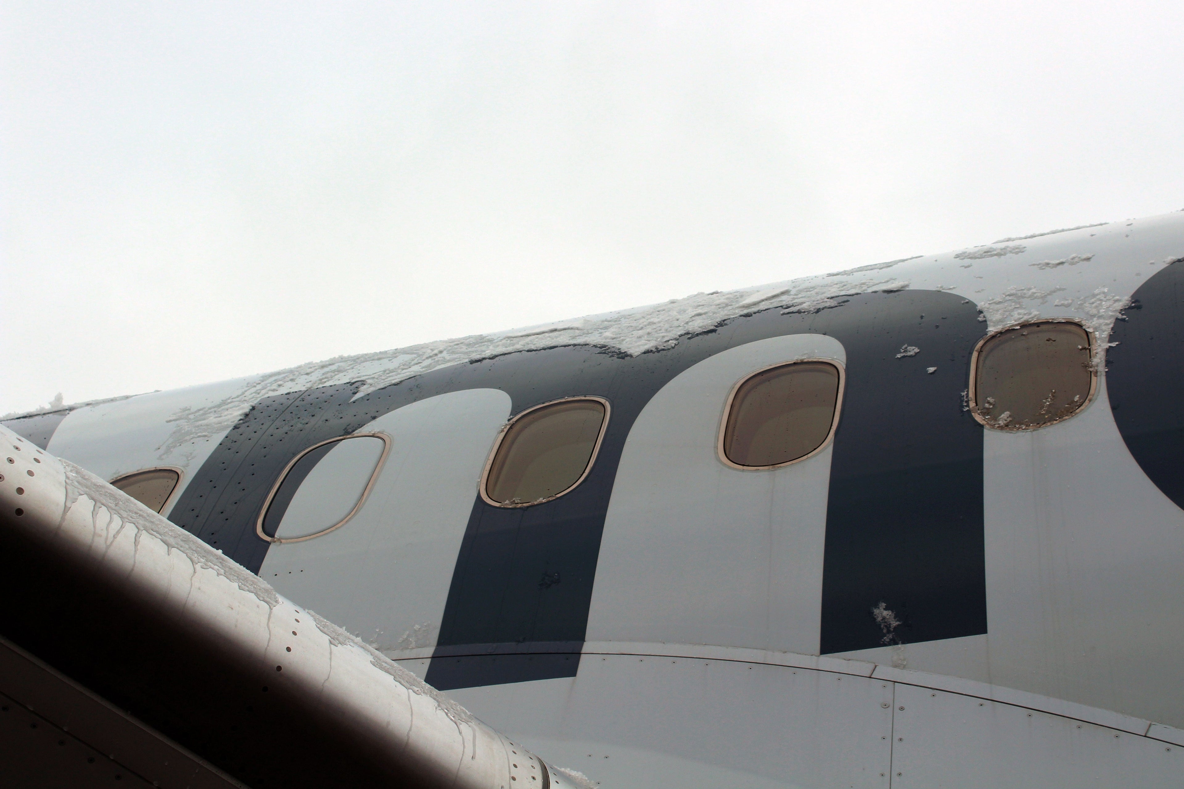 Ice and snow on the fuselage and leading edges of the wings at the root, just prior to de-icing (Image by the author)