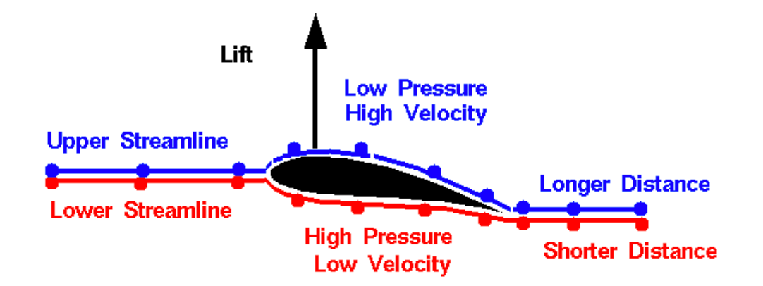 According to explanations that cite Bernoulli, the wing is shaped so that air moving over the top of it has a longer path to travel than air traveling across the bottom of the wing.