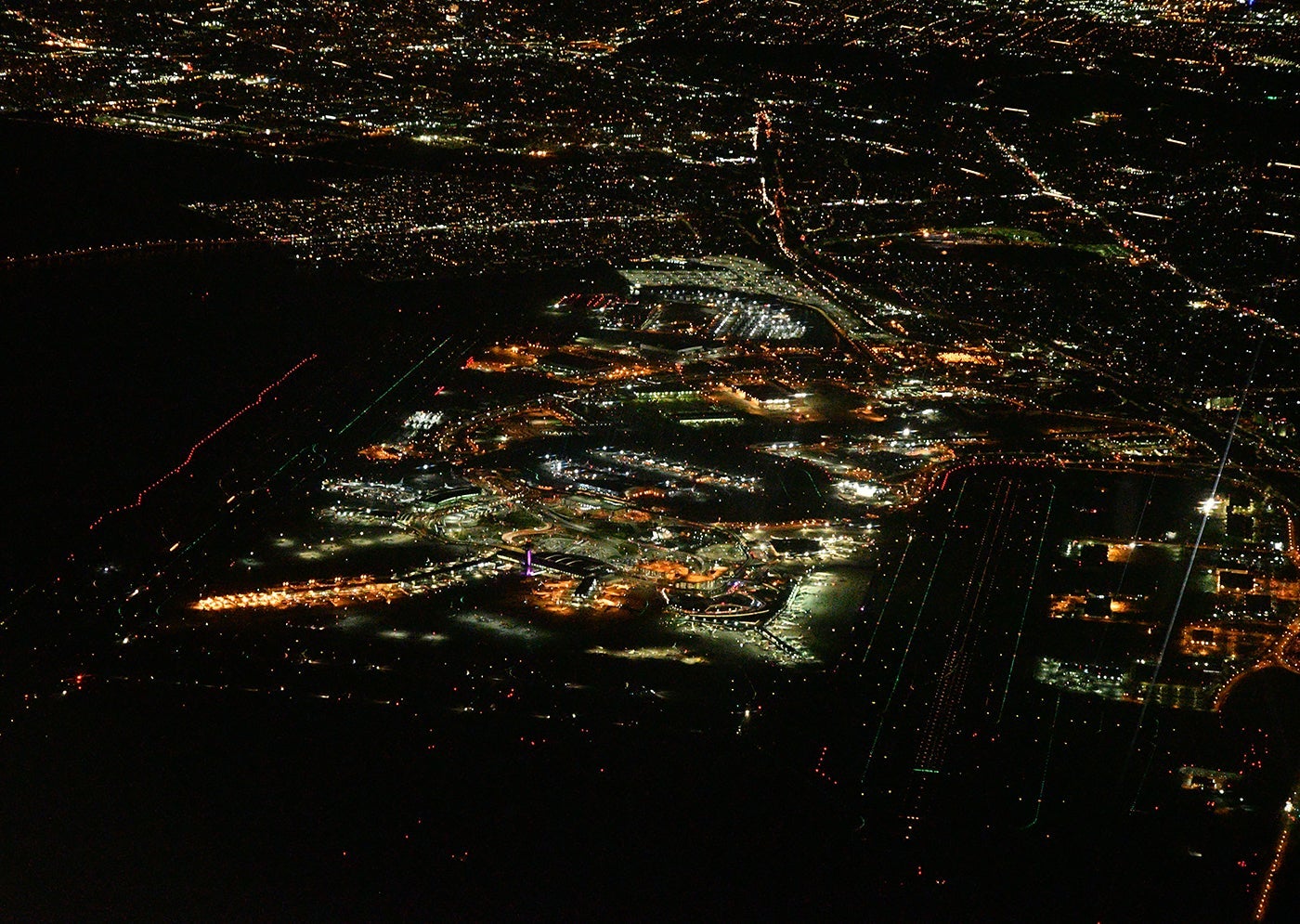 "It's easy to think of airports as very well-lit places," Vanhoenacker said. "But when we are looking out the cockpit window at a cityscape, the airport may well be one of the darkest parts of the view. Taxiway lighting, for example, is quite subtle until you're close to it—which helps keep our eyes acclimated to the night world. Looking out at night across a large and well-lit city, the darkest region you can see may well be the airport itself."