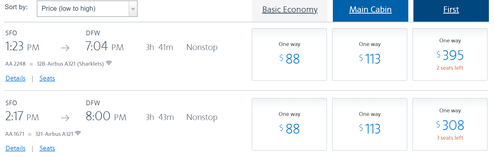 At first glance, these two flight options may seem rather similar in economy. They are the same price in both basic economy and Main Cabin and have similar departure, arrival and duration times. However, when you look closely, you'll see 32B for the 1:23pm departure and 321 for the 2:17pm departure. If you value in-flight power, extra-legroom seating and in-flight entertainment, you're going to want to opt for the earlier flight.