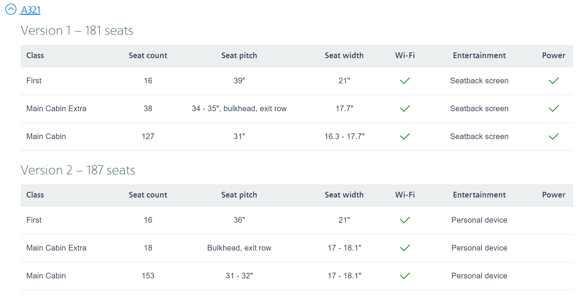 What's the difference? Well, here's how AA's website describes the two planes. American Airlines planes (LAA 32B) are Version 1 and US Airways planes (LUS 321) are Version 2: