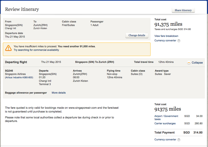 Singapore’s flights to Europe, including London, Paris and Zurich, are among the longest it operates on the A380 at around 12.5-13.5 hours each. Though the London and Paris routes tend to have very limited award availability, I have had better luck when searching for awards to Zurich, such as this one I found in October for 91,375 miles (there seems to be a little glitch on the page that is misrepresenting the final amount) and SIN$280.80 (US$206).