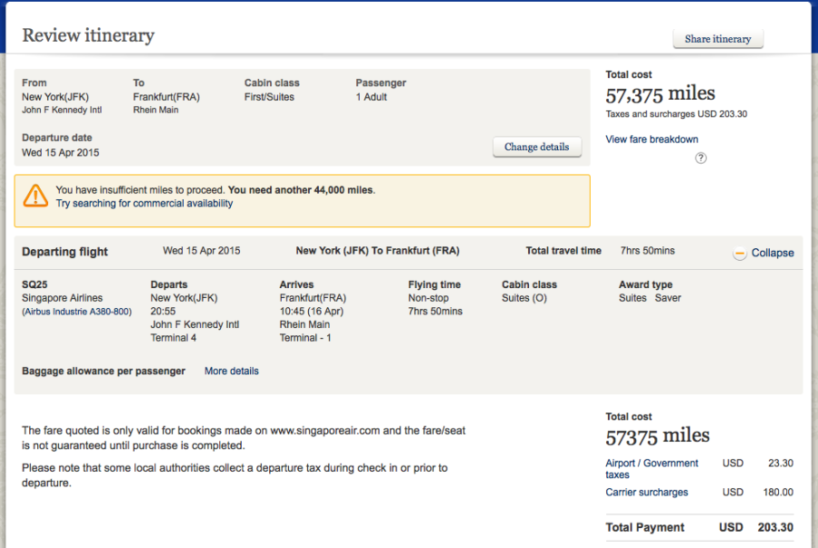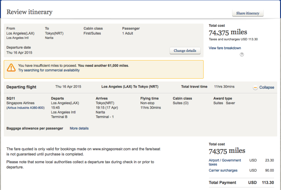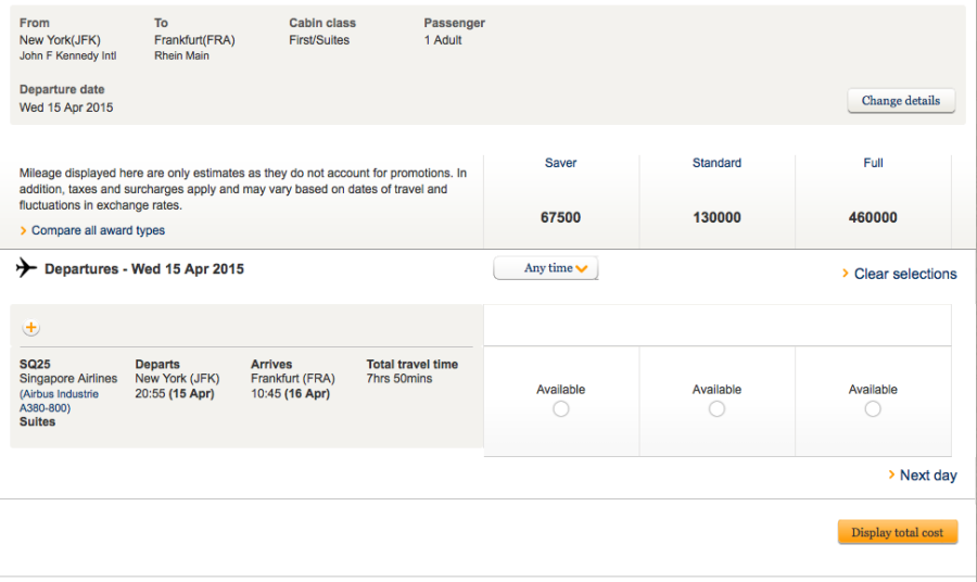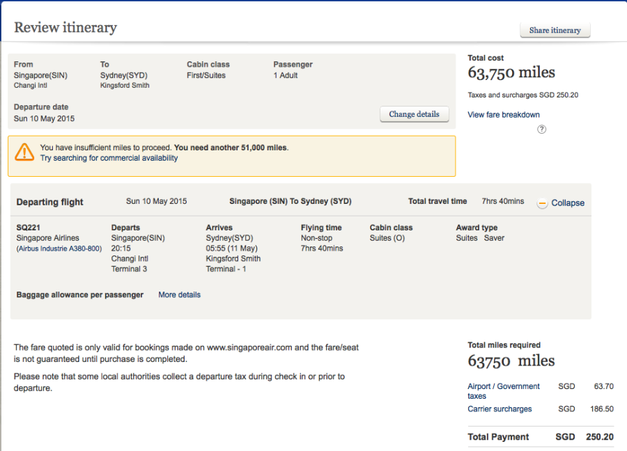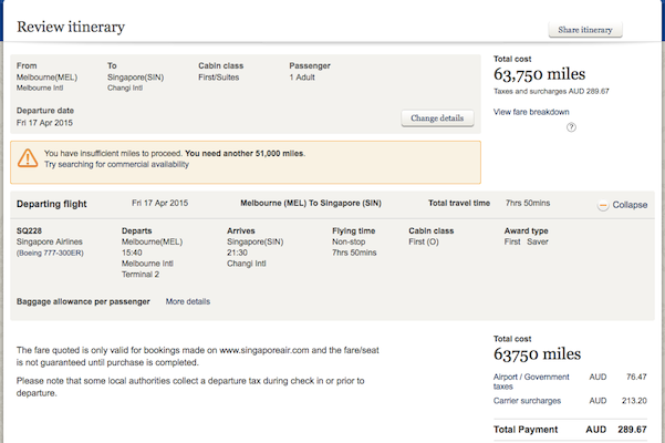 Here’s a sample award for later this week on SQ227 from MEL-SIN in first class for 63,750 miles and AU$290 (US$223).