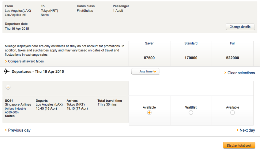 With such a coveted first class product, Singapore award availability can be rather limited on many of these routes. But the airline also offers a “Waitlist” option on many awards that allows you to waitlist an award at the saver level.