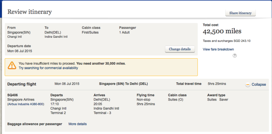 Here’s a sample award from Singapore to Delhi in July for 42,500 miles and SIN$243 (US$179).