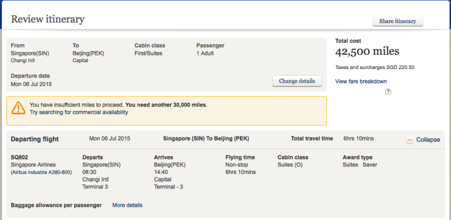 Here’s another sample award from Singapore to Beijing the same day for 42,500 miles and SIN$220.50 (US$162).