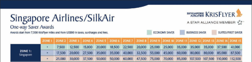 Here is the Singapore award chart for its own flights. As you can see, it's split into a whopping 15 country-based zones, all radiating out from the hub in Singapore.