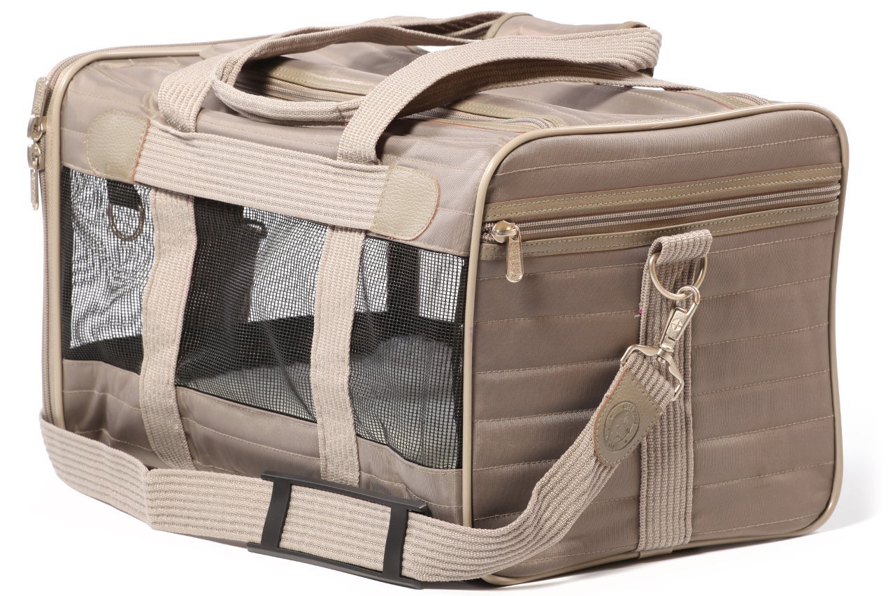 The Sherpa Original Deluxe Carrier is extremely popular on pet travel forums. It has many excellent features including top and side entry, mesh panels for ventilation, locking zippers, a patented spring wire frame, a rear pocket, padded hand carry straps, an adjustable shoulder strap, a machine-washable liner and a seatbelt and luggage attachment strap.
