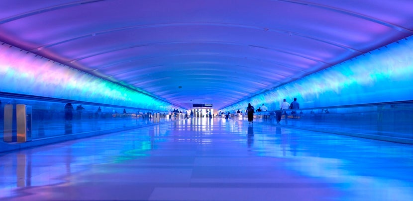 Anyone who says that airport-bound layovers are boring probably hasn't been to DTW. Its three concourses —A, B and C — and the McNamara Terminal are interconnected by an underground "Light Tunnel," an installation designed by Pontiac, Michigan-based FoxFire Glass that grabs your attention with multicolor LED lighting and sound.