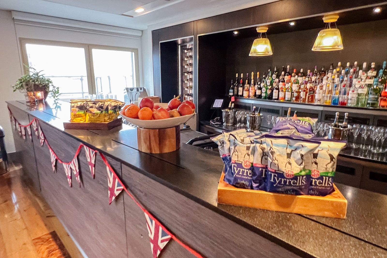 Food options are plentiful. The pantry is a self-serve area that offers a range of sandwiches, cheeses, cold cuts, cereals and pastries earlier in the day; it features olives and hummus later on. Close by, you’ll also find a self-serve bar offering beers, wines, spirits and, of course, Champagne.