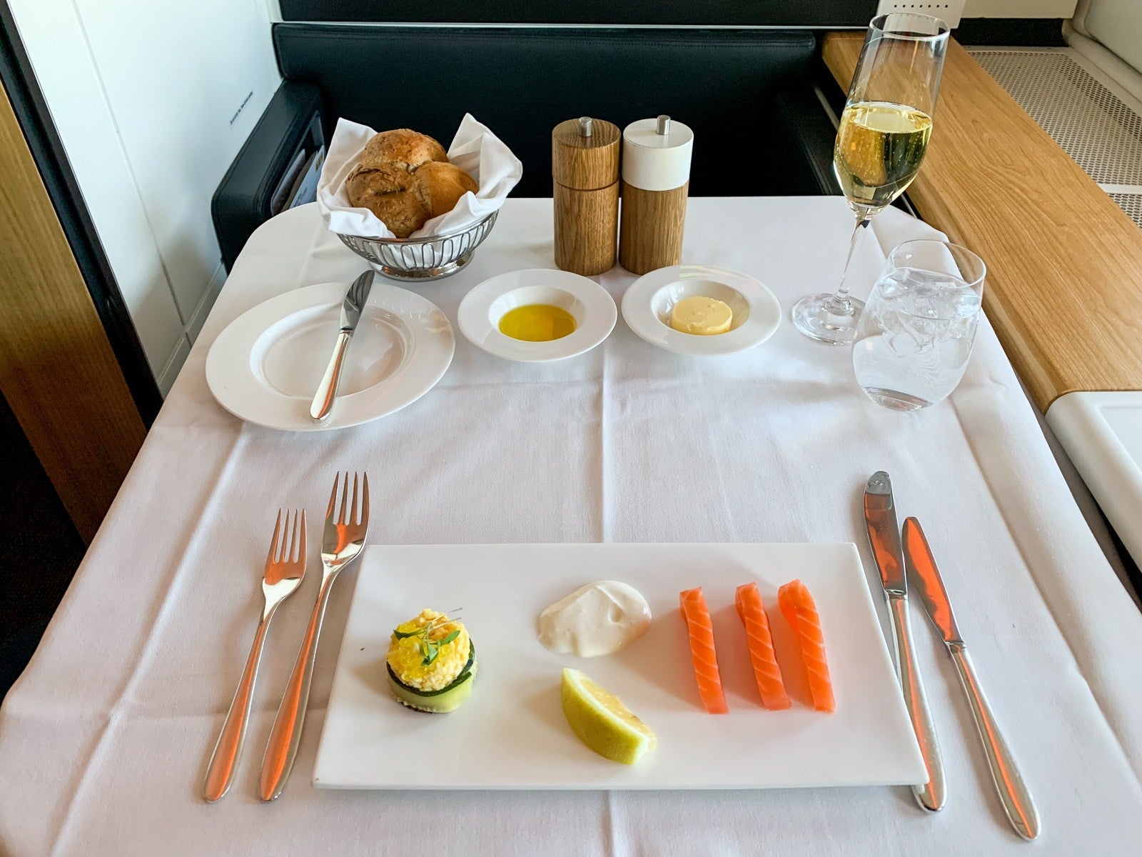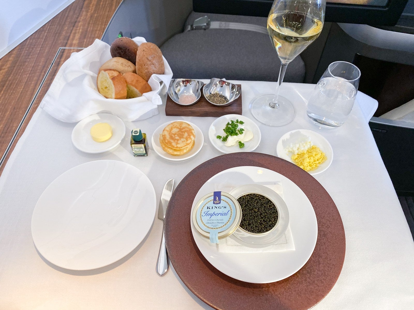 There's just something about eating caviar at 35,000 feet, and Hong Kong's Cathay Pacific is one of the carriers that does it best. Global news editor Emily McNutt loved how her dining tray was transformed into an elegant ode to the finer things in life with a full 20 grams of King's Imperial caviar and all the fixings including blinis, creme fraiche and finely chopped eggs.