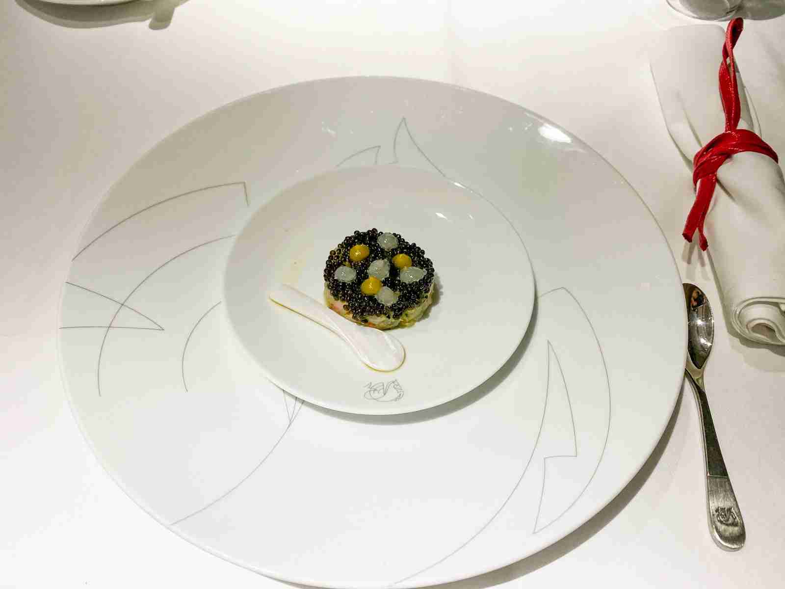 Not only was the main course delicious, but there were several other courses of deliciousness, including an appetizer of langoustines, Ossetra caviar, fruit and gentian drops, complete with a mother-of-pearl spoon to top off the elegant presentation.