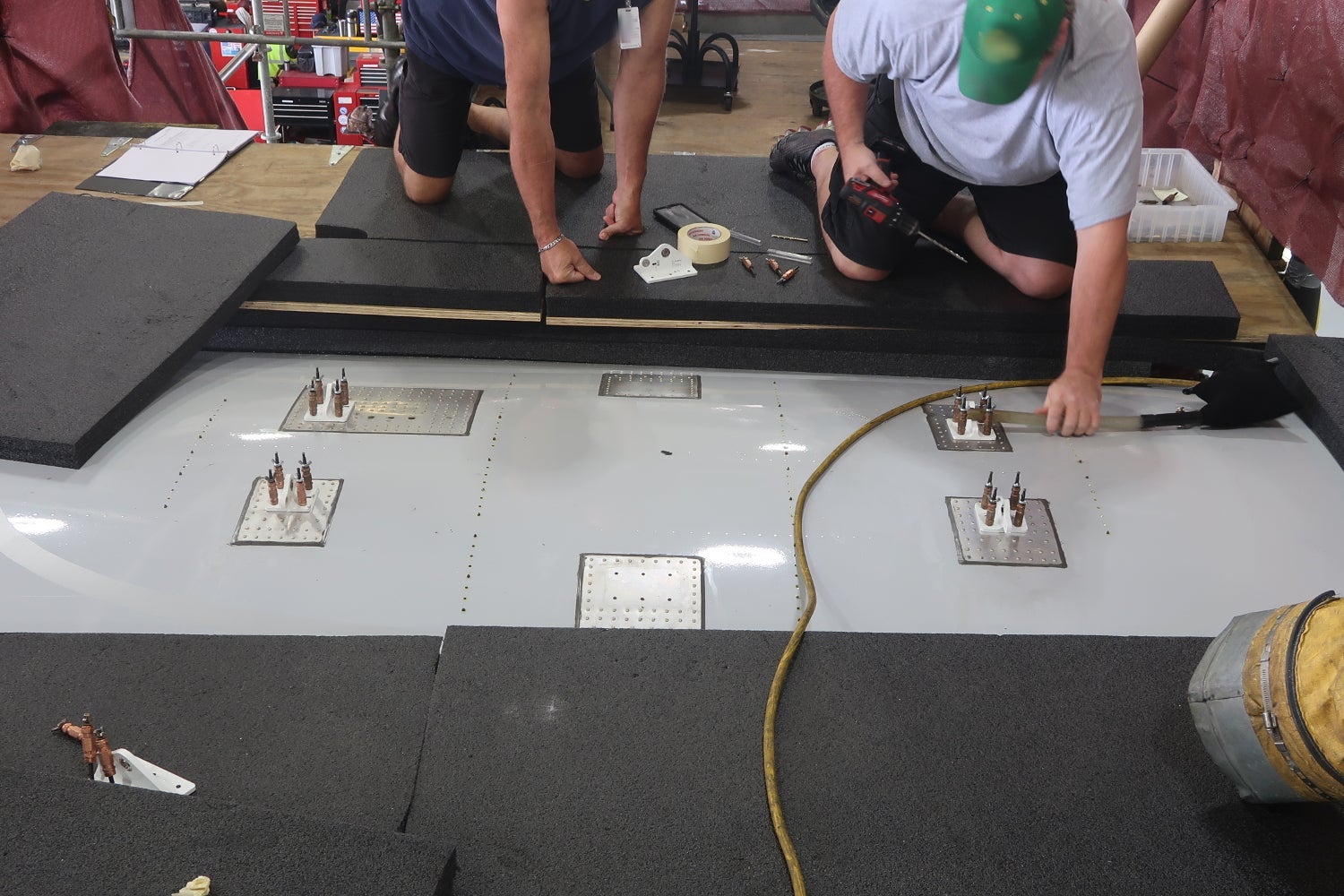 When I'm hoping to work on board and the Wi-Fi is slow or — even worse — there's no Wi-Fi available on the plane, I tend to be frustrated. But, as we found when we saw multiple Wi-Fi receivers being installed, the installation process is time-consuming and intensive. As we saw as we stood on scaffolding above one plane, the receivers are mounted on top of the plane by drilling six mounts into the plane's shell. And then multiple access points are installed throughout the plane to provide coverage throughout the entire cabin.