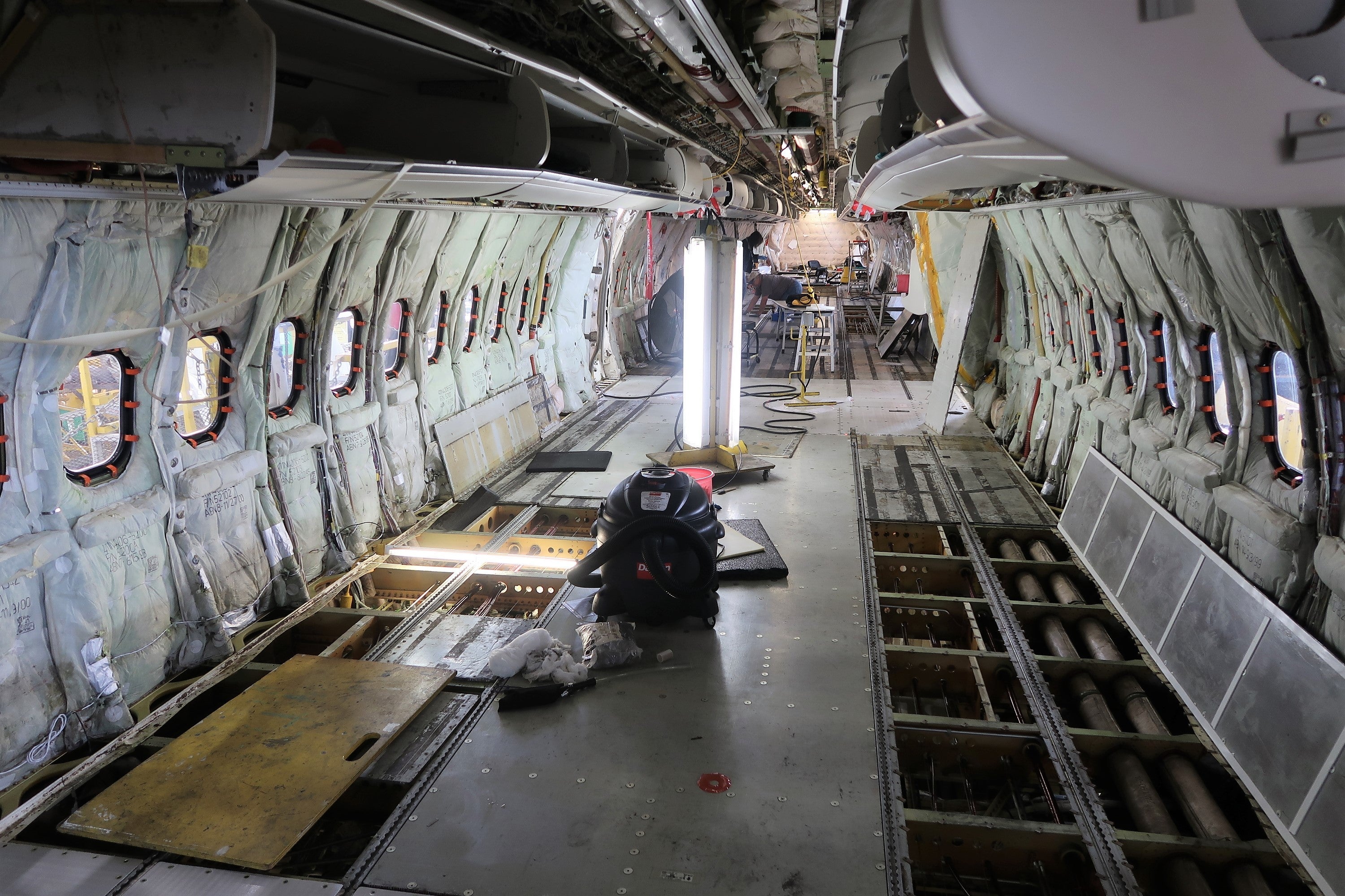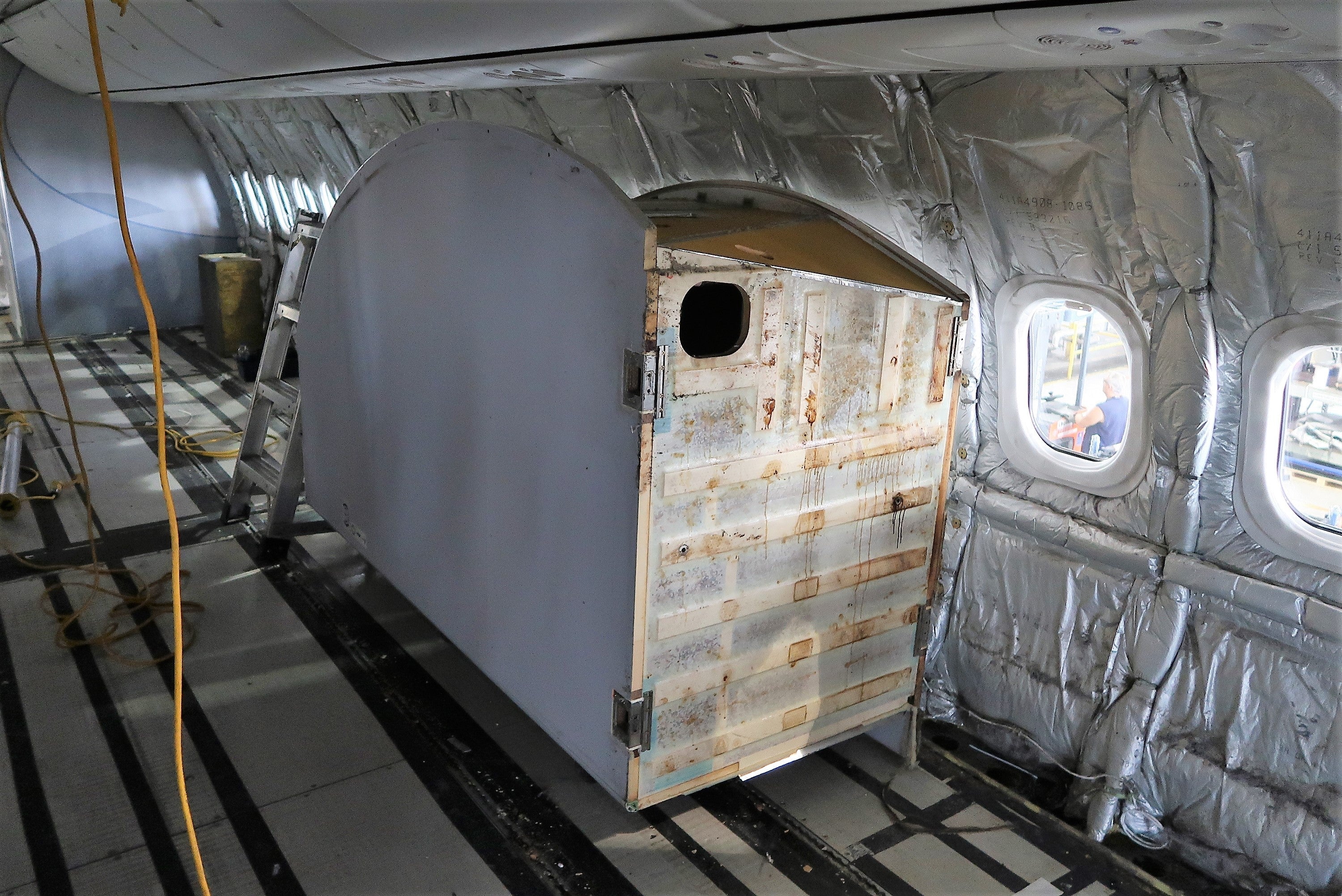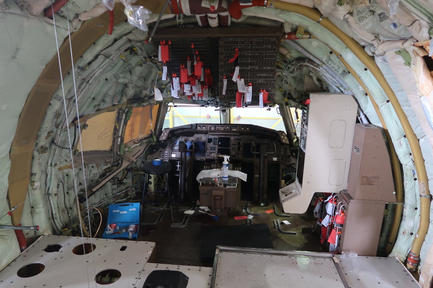 As we walked through the mostly empty shell of a plane, I walked up to a rounded waist-high storage container. Interested to see what was inside the container, I peered into a hole in the side of the container but instantly regretted it. A strong smell wafted into my nose that identified the container as a yet-to-be-refurbished lavatory.