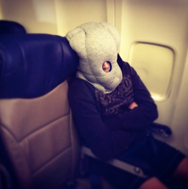 This one is easy. Grab your neck pillow — or head sock with a breathing hole as seen above — and make yourself as large as possible and then fall asleep — or "fall asleep." Try your best to slowly inch toward encroaching on the middle seat, making it known to all passerby that this movement is entirely possible — and probable — during the flight. And as an added bonus for this maneuver, you can avoid the dreaded eye contact with all those passing by. The less eye contact that's involved, the better.