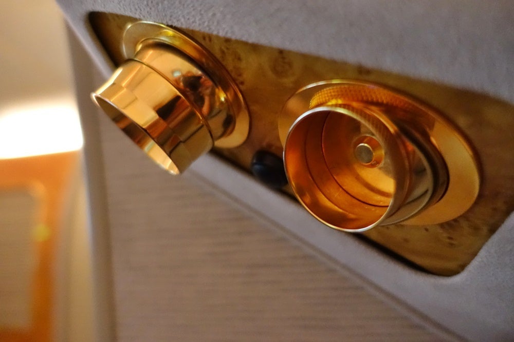 There were even little tiny pillboxes you open and sniff — one to induce sleep and one to focus. The lights and air vents are made of gold (unsure if it's 24k or just gold paint, but who cares because they look cool and they aren't the crusty grey air vents you have to share with your neighbor in coach.)
