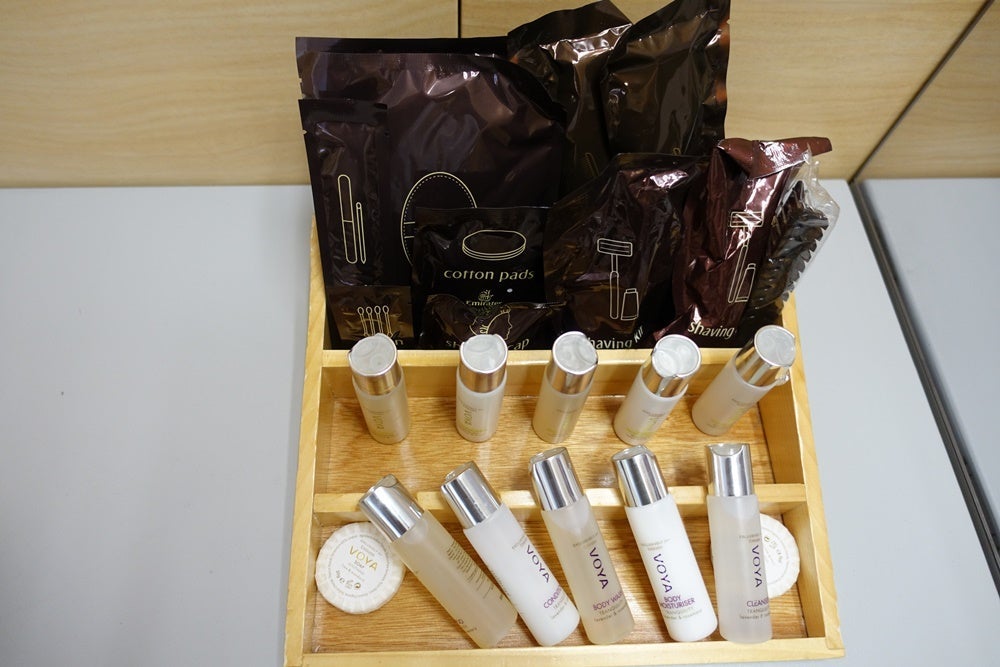 The sleek wood-style decor makes the bathroom seem much fancier, and there were enough toiletries in there to freshen up everyone on the plane! Razor and dental kits, plush white towels, shower caps, body lotion and q-tips were available in addition to the typical soap, shower gel, shampoo and conditioner in various scents. The floor is even heated so once you shower, your feet are warm.