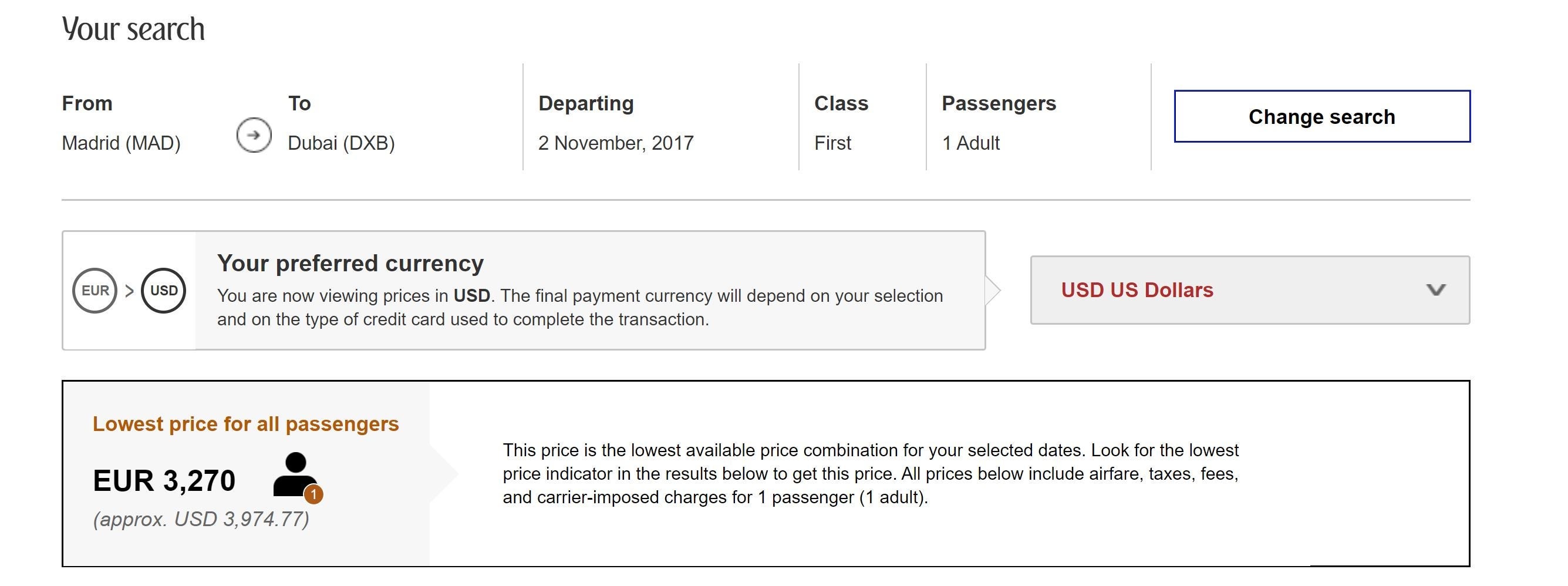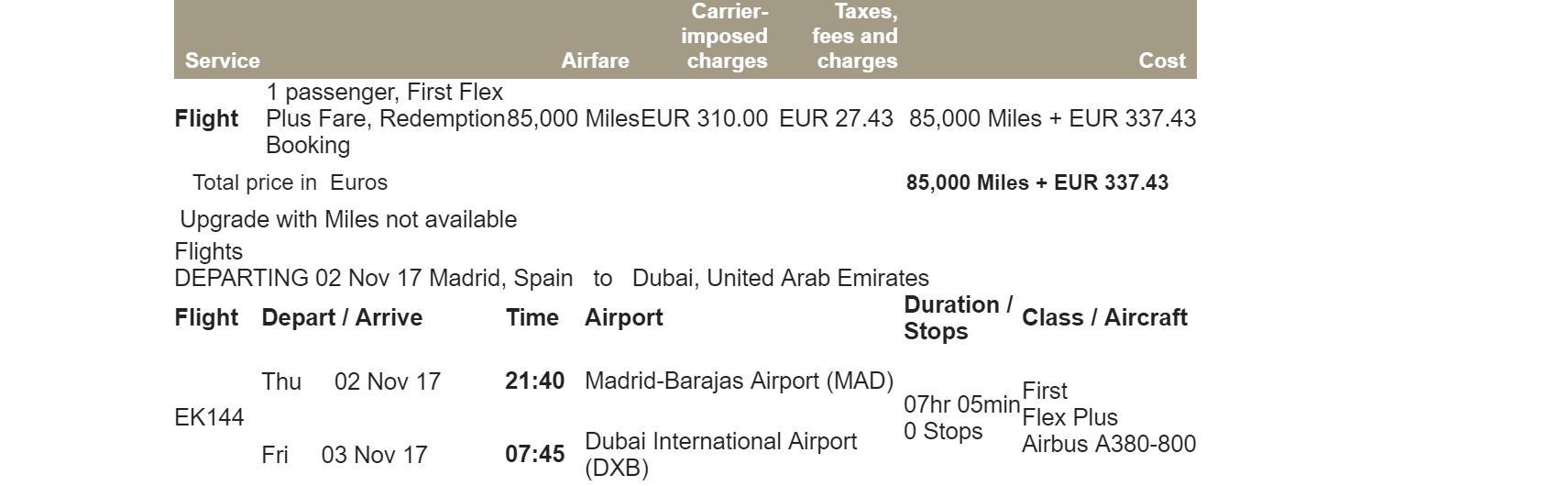 I used 85,000 American Express Membership Rewards points plus 337 euros in taxes and fees ($389) for my one-way ticket from Madrid (MAD) to Dubai (DXB). These points transfer directly from Amex to Emirates' Skywards program with a 1:1 ratio.
