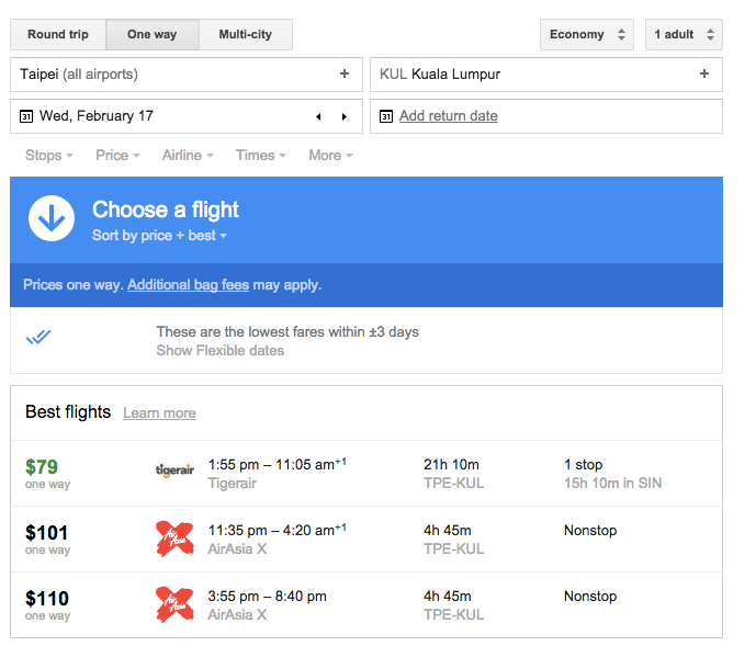 Tigerair and AirAsia fares between Taiwan's Taoyuan International Airport (TPE), Singapore Changi Airport (SIN), Kuala Lumpur International Airport (KUL) and Bali Denpasar Airport (DPS) typically undercut all the other carriers for the dates I needed, with both airlines offering at least one or two flight options each day. In addition, both airlines regularly offer additional discounts — for instance, waiting until Thursday to book travel during "Tigerflash Time" can save you up to an additional 30-40%.