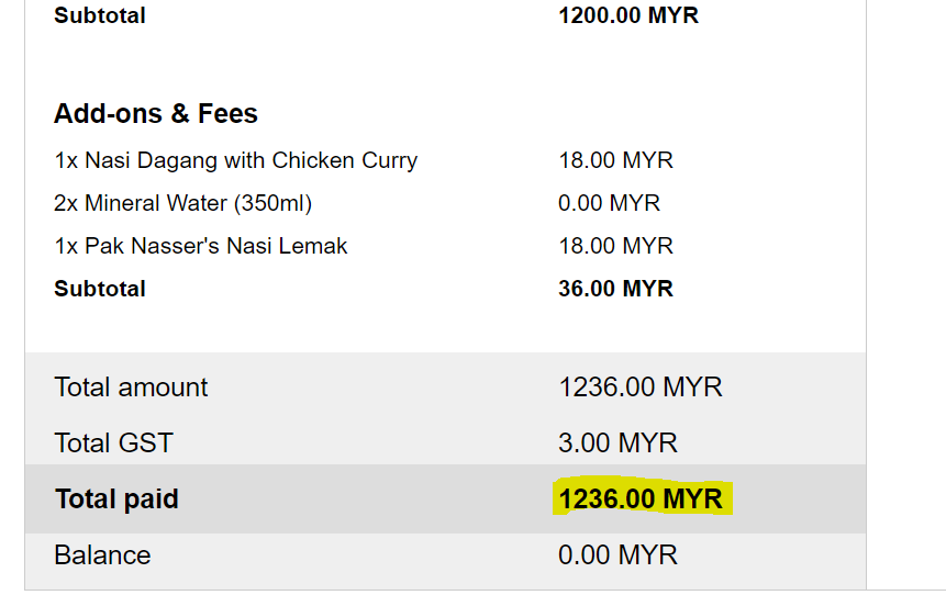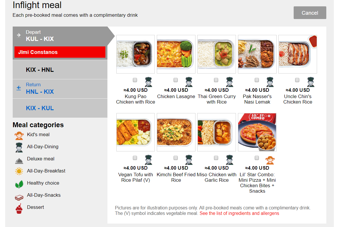 The only additional upgrades I bought were two meals I purchased during booking for 18 MYR ($4.57 USD). If you are going to buy a meal, don't wait until you are on the plane. Not only are the prices significantly higher, but a different menu is used on the Kuala Lumpur to Osaka leg, with prices starting at $16.