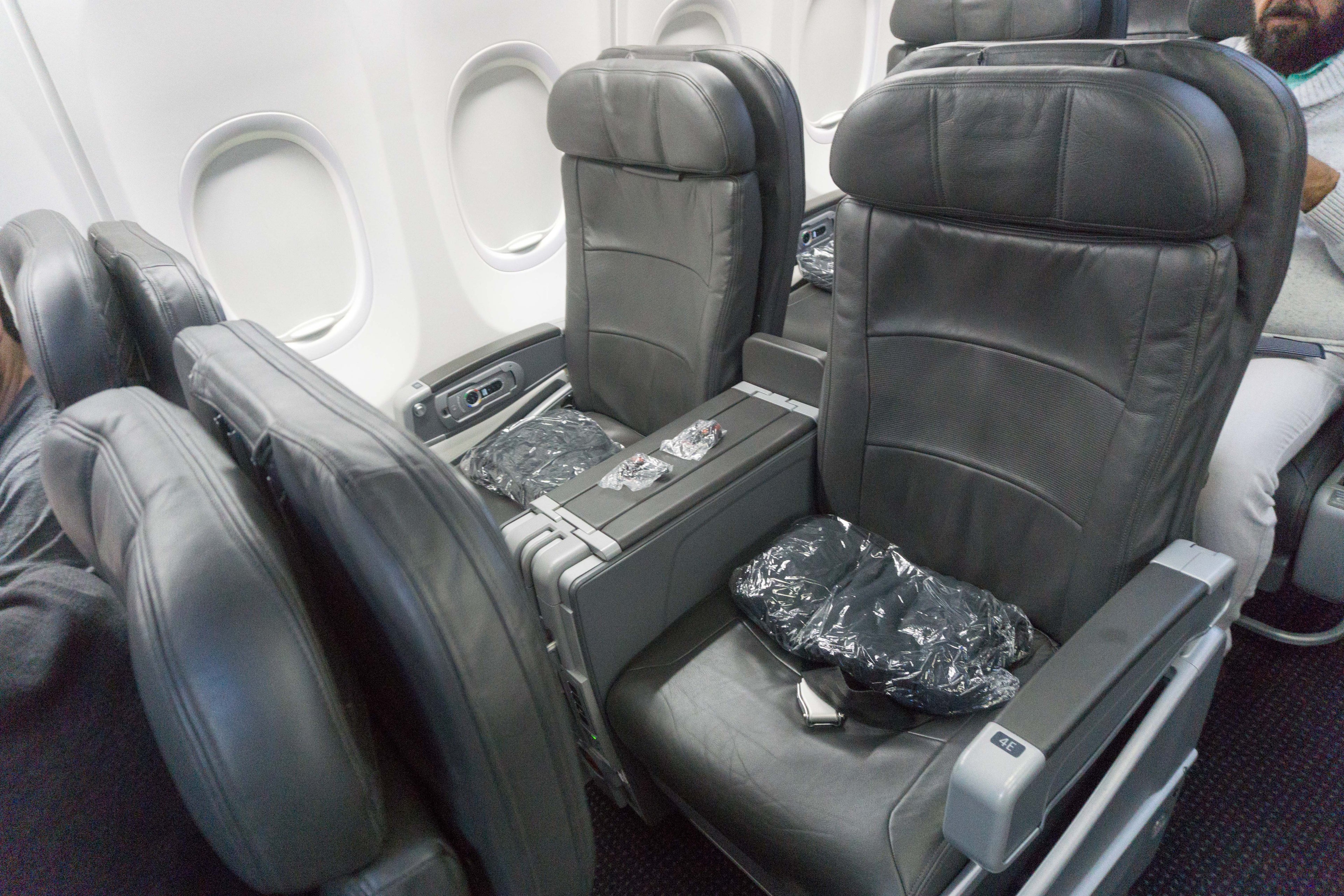 The premium cabin was arranged in a 2-2 configuration, which is standard for the 737. We were in seats 4E and 4F in what was actually only the second row of the aircraft. Each seat was about 20.5 inches wide and offered 40-42 inches of pitch — plenty of room for the relatively short flight.