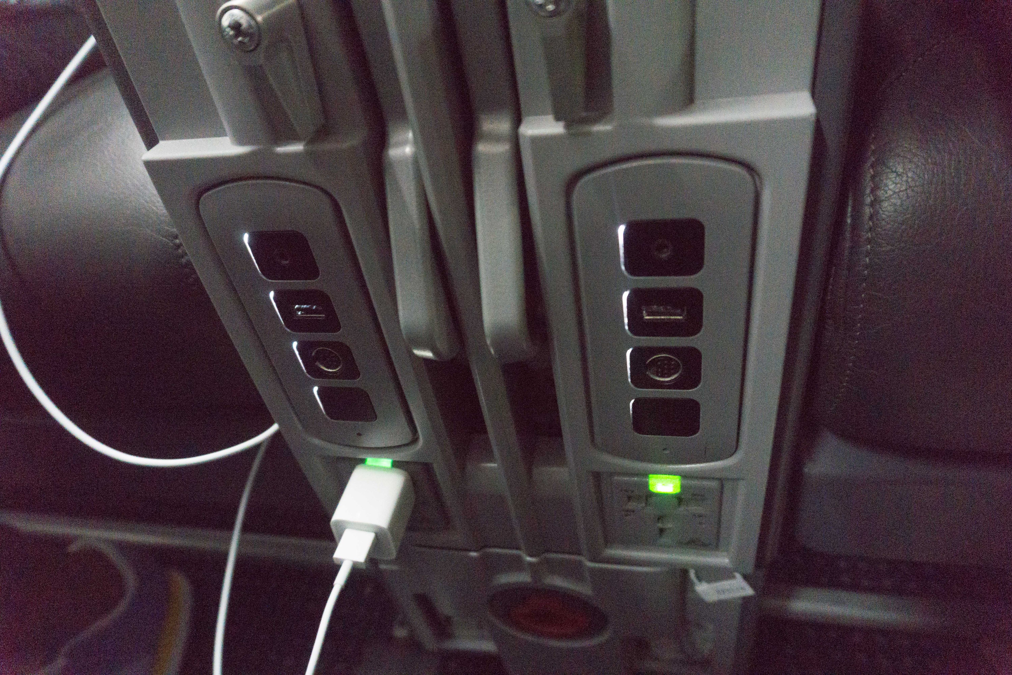 Each seat had a universal power outlet and USB port above it.