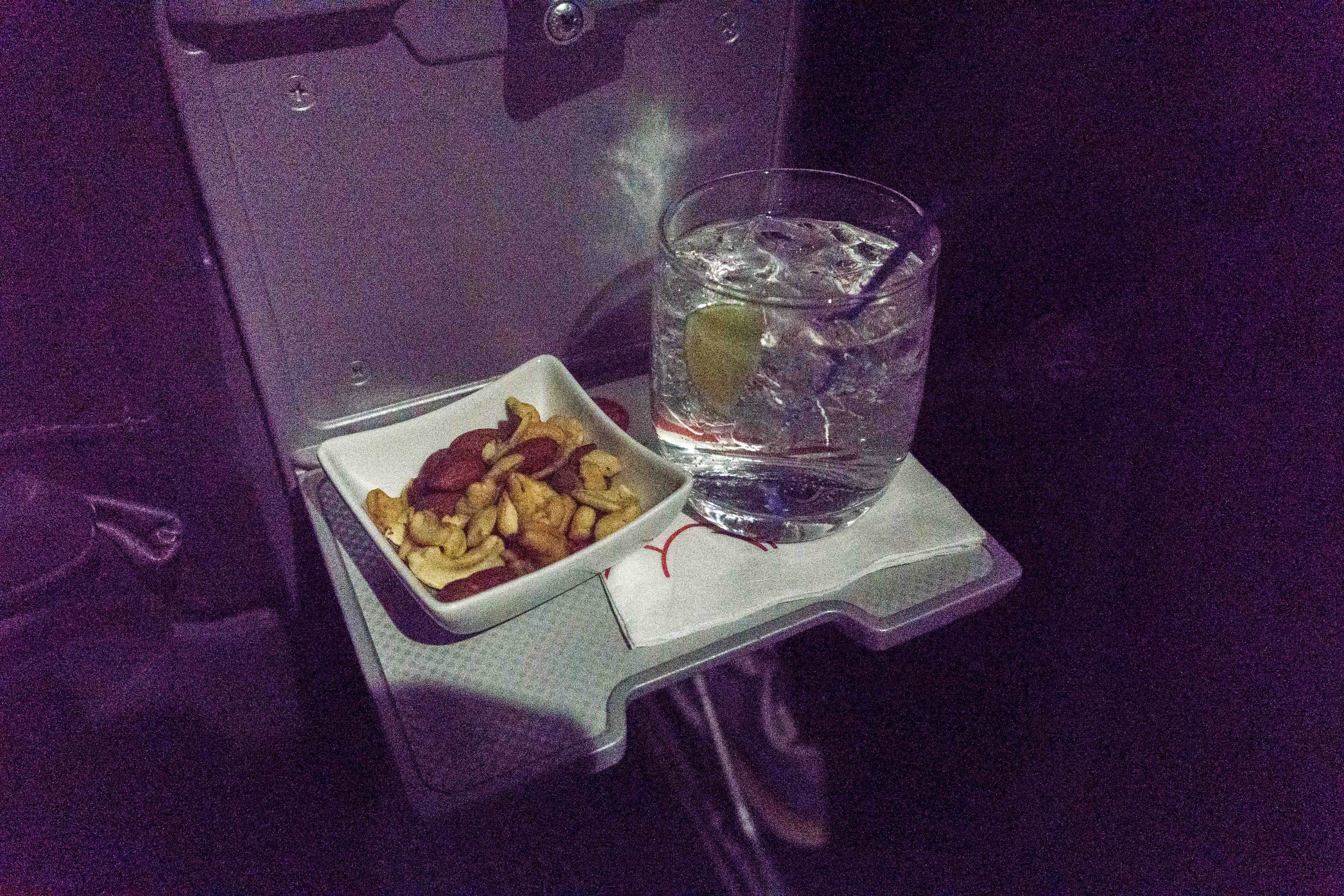 After we reached cruising altitude, the FA came around for another round of drinks and brought out warm nuts. Most of the cabin had dozed off, but I decided to knock back one more gin and club soda before falling asleep.