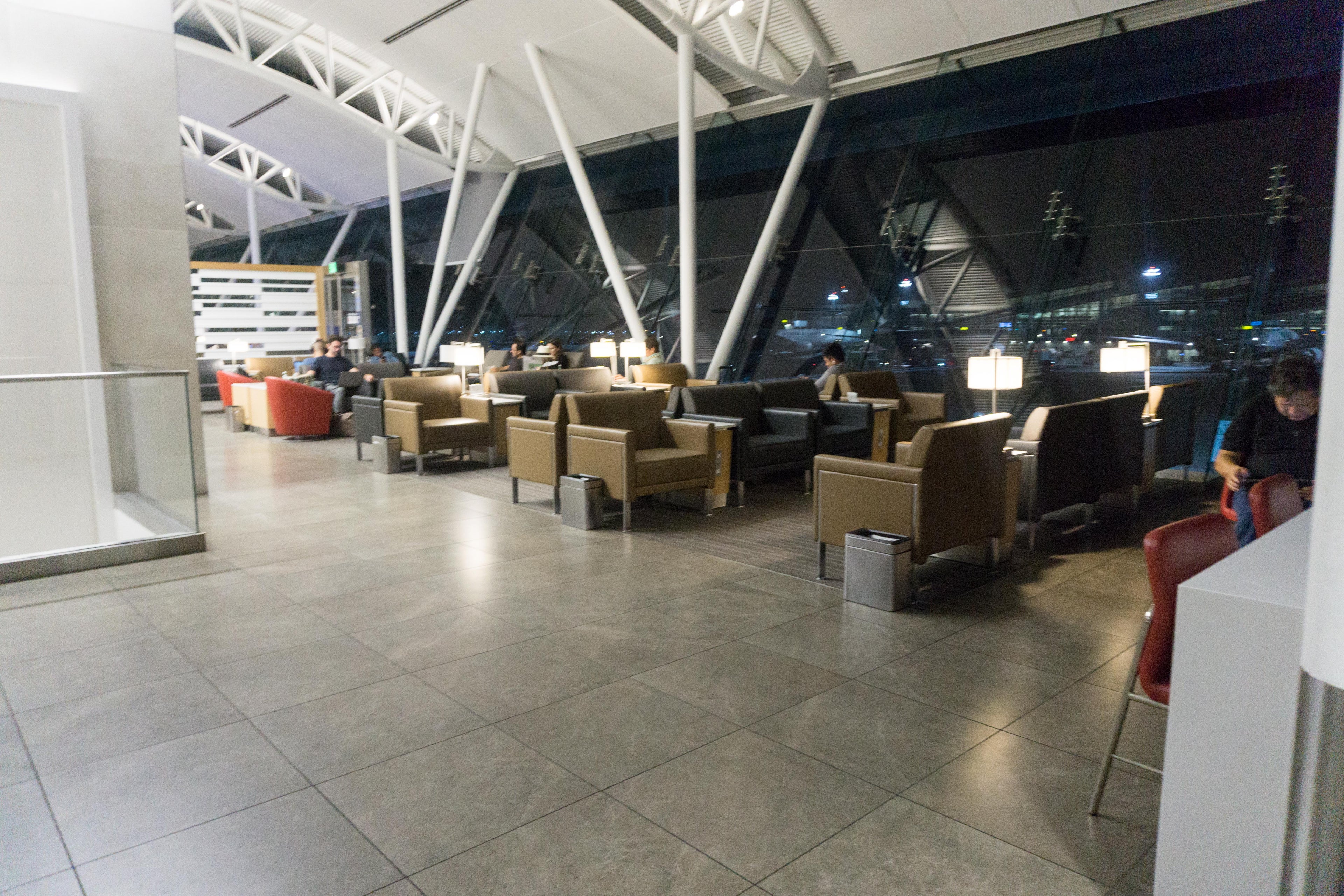 The lounge had comfortable seating areas with plenty of power outlets and an airy feel thanks to the high ceilings.