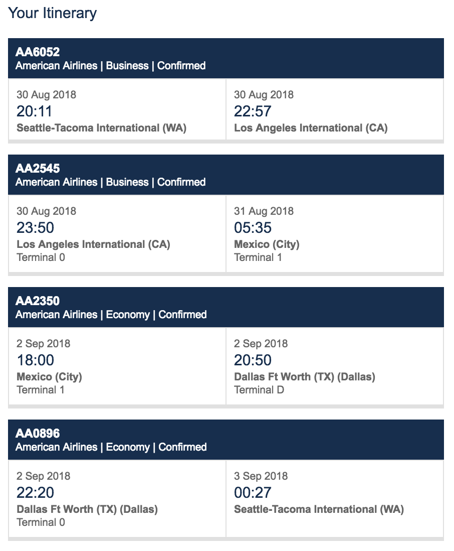 That came out to around $416 per person round-trip, outbound in business class and the return in economy on American Airlines. While this wasn't the epic redemption I was dreaming of when I procured the 90,000 Iberia Avios, it still seemed like decent-enough value considering similar flights were selling for $900 to $1,000. The premium-cabin leg from LAX to MEX was marketed as "Business," AA's classification for international flights under 3,000 miles. This isn't to be confused with "Flagship Business," which refers to international flights longer than 3,000 miles featuring lie-flat seating.