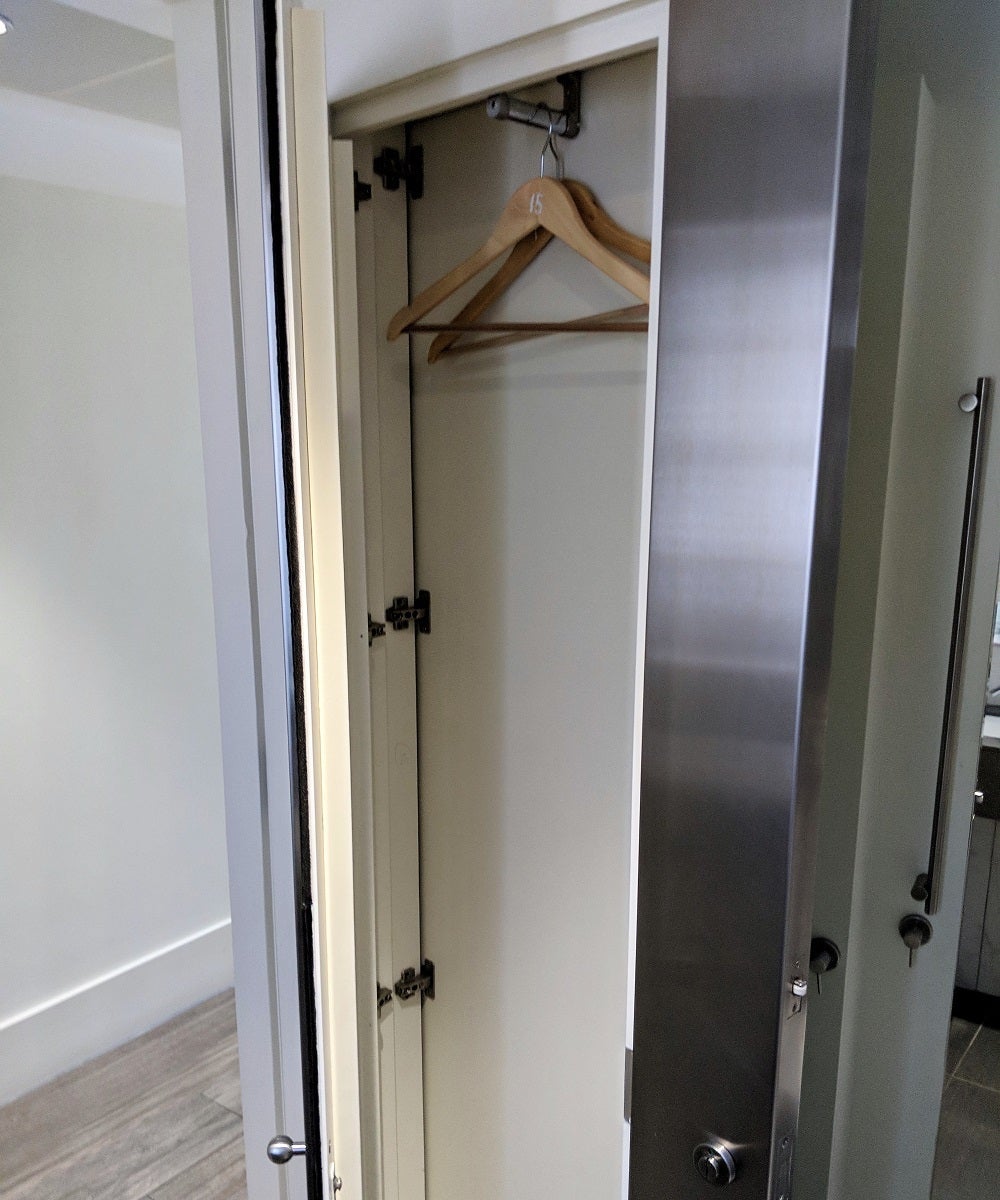 This lounge offers a feature I haven't seen in any other lounge: a valet pressing service. A guest needing to look fresh for a meeting — whether in the lounge or in the city — can place his or her shirt and pants in the double-door compartment built into each shower-room door. With a press of a button on the wall, a lounge worker comes to collect the clothes to be pressed while the guest showers.