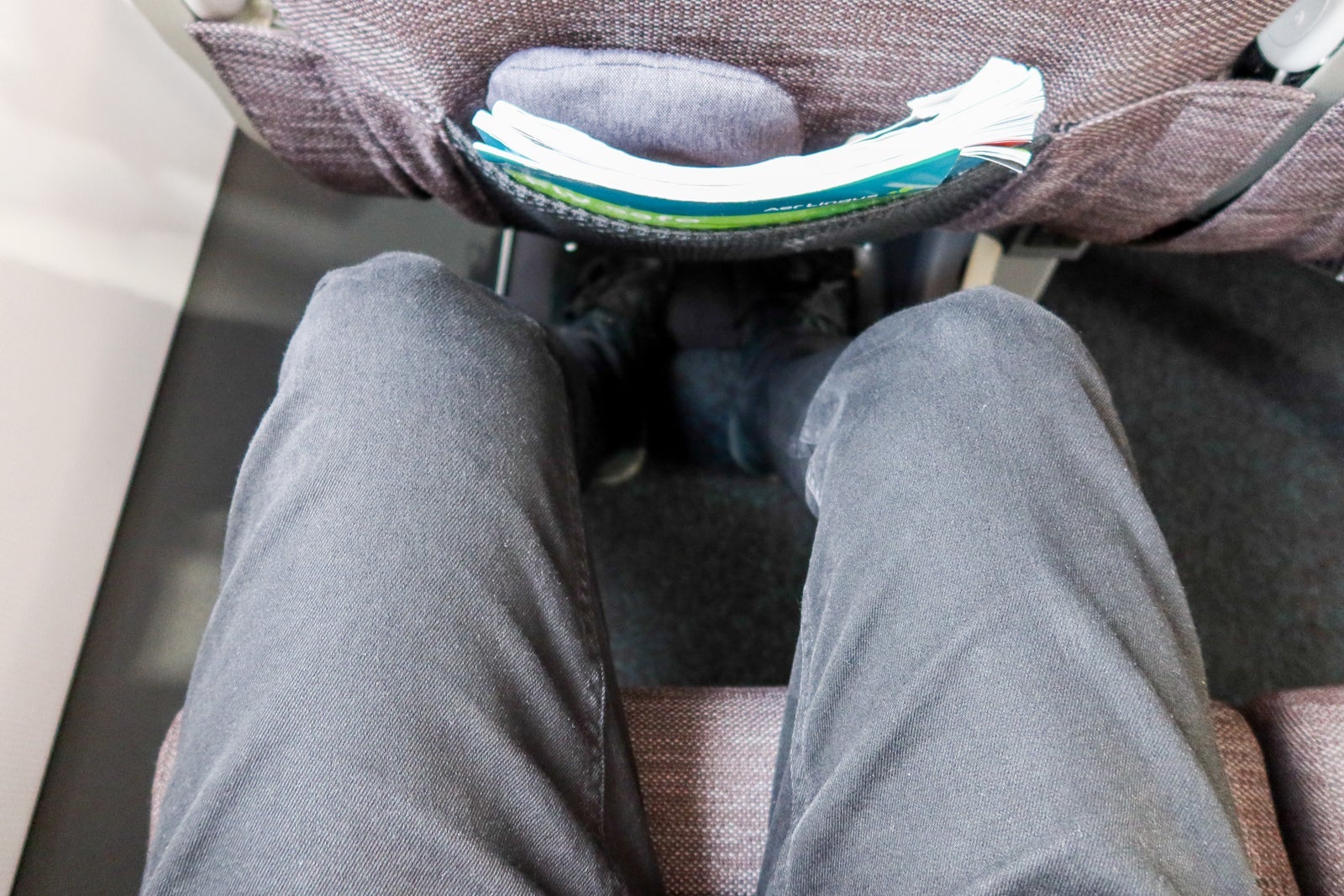 While my 22A window spot looked good to the eye, I was a little disappointed by the feel of the seat. 18-inch width and 31-inch legroom are pretty standard in coach, but slimline seats like these can feel hard and poorly padded. They sacrifice padding and seatback thickness to maximize legroom in the small space available.