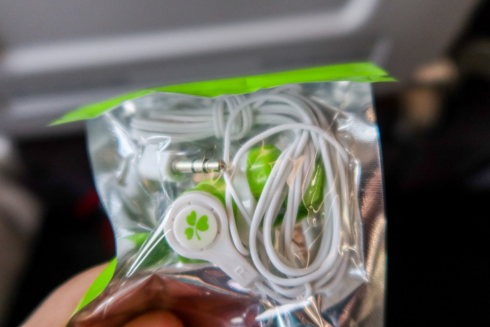 The headphones, branded with the Aer Lingus shamrock, unfortunately didn't perform particularly well. As a rule of thumb it is always worth bringing your own noise-cancelling headphones for economy flights rather than relying on those provided by the airline. If the aircraft uses a two-prong jack, like it did in this case, then you'll also need an adapter with you.