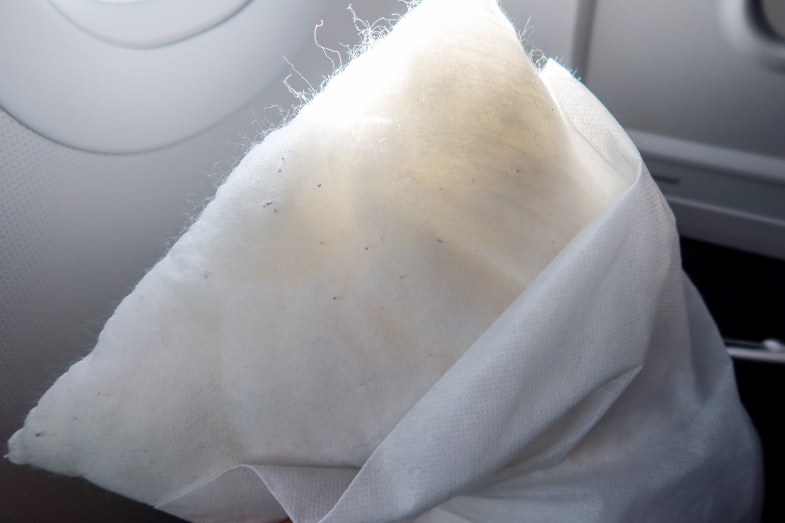 The blanket was large and soft, and certainly would have kept me warm enough if I had needed to sleep during the flight. The pillow, however, was cheap, thin and already coming out of its cover.