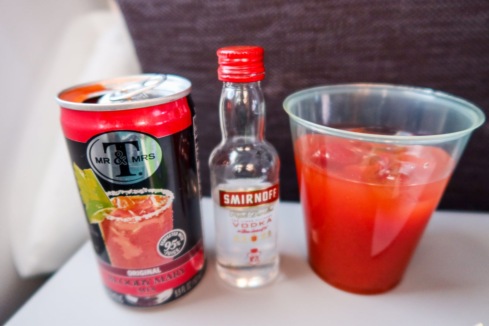 The first drinks service came around about an hour after take off. I asked for a Bloody Mary and was impressed that I was given the choice between Smirnoff and Grey Goose vodka. The drink was delicious and refreshing, though it did set me back another £6 ($7.80). Disappointingly there was no complimentary beer or wine either; I would have had a free glass of either at a higher fare level.
