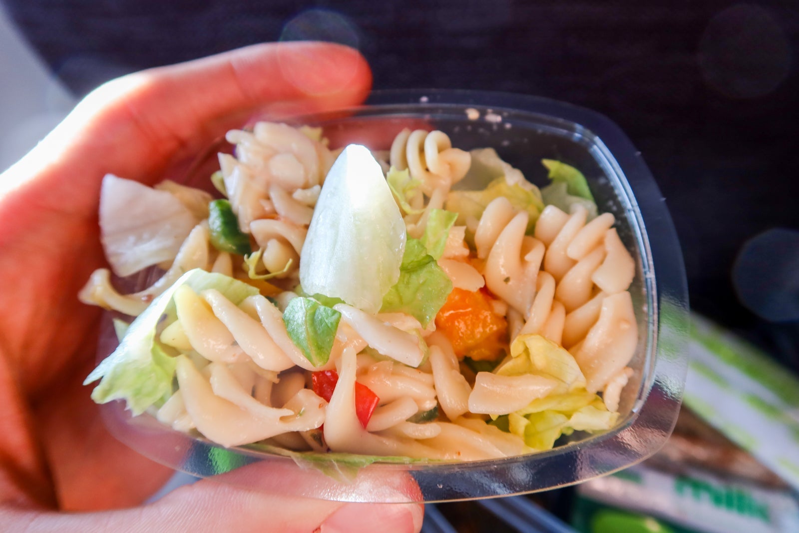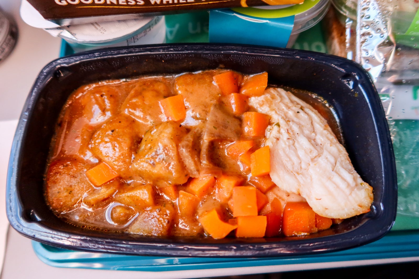 About 20 minutes later the meal service began, and I was offered the choice between chicken breast or pasta bolognese for my main course. I opted for the chicken, which was then handed to me on a tray with a handful of side dishes.