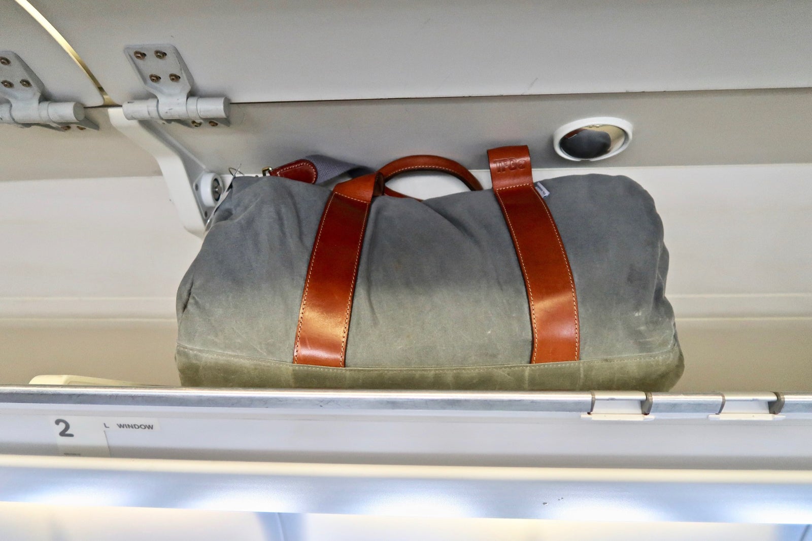 There was a storage next to the TV that housed the safety card (though no other BA or Air Belgium literature) and that I used to store my laptop and newspapers. The side table provided plenty of space for drinks books and phones. The overhead bin space felt tight — my bag just about fit, but I don't think a bigger rollaboard bag would have easily fit into the space.