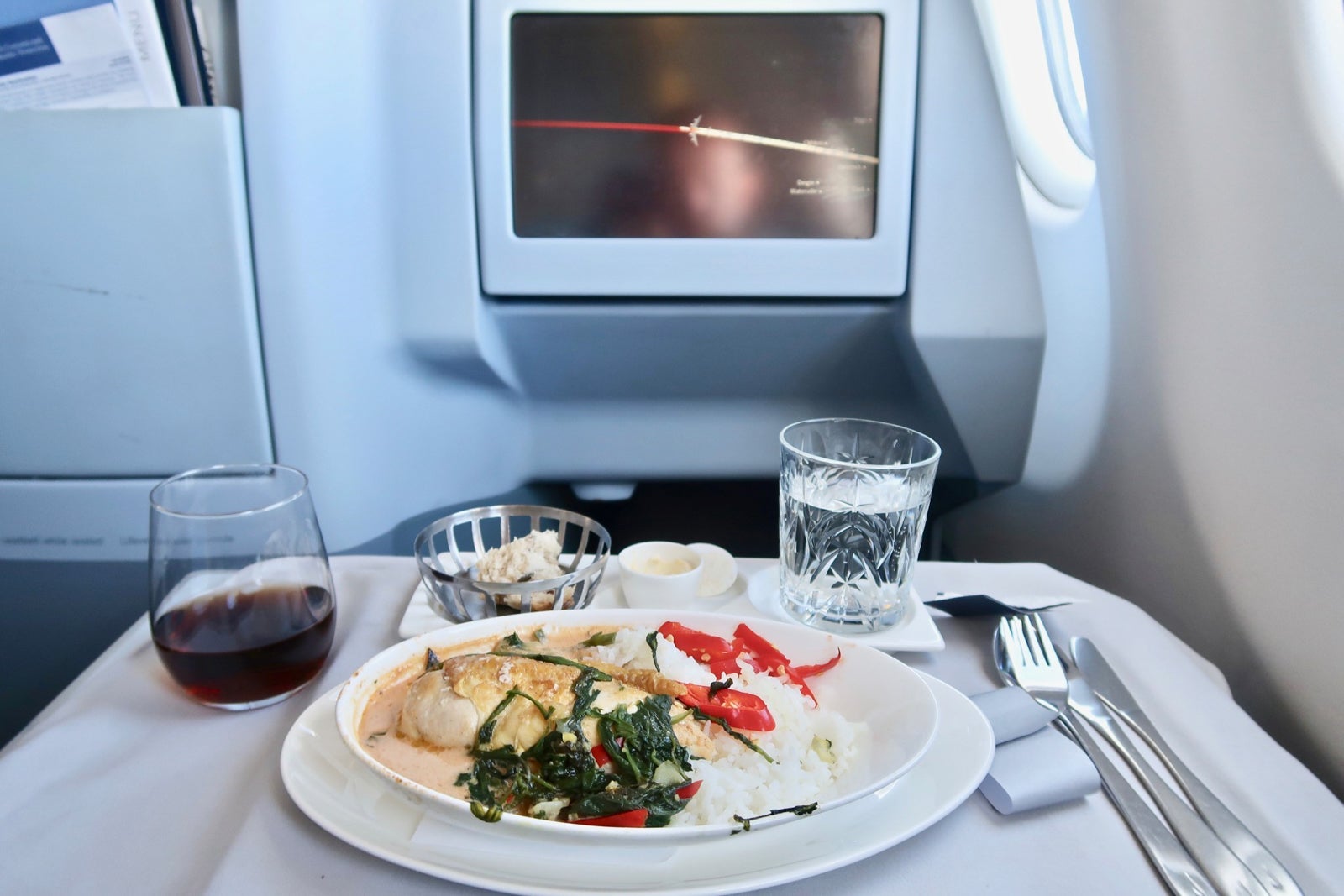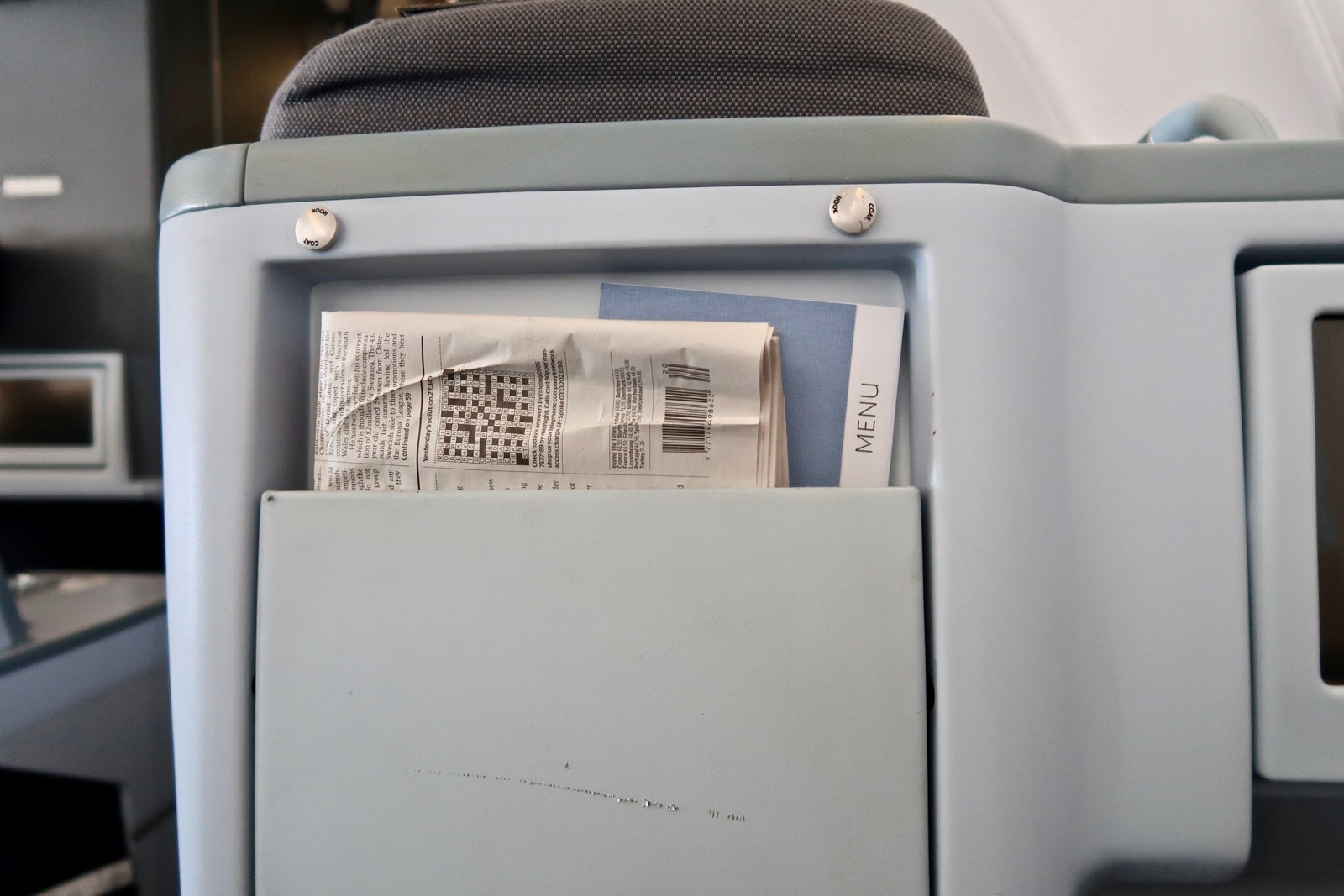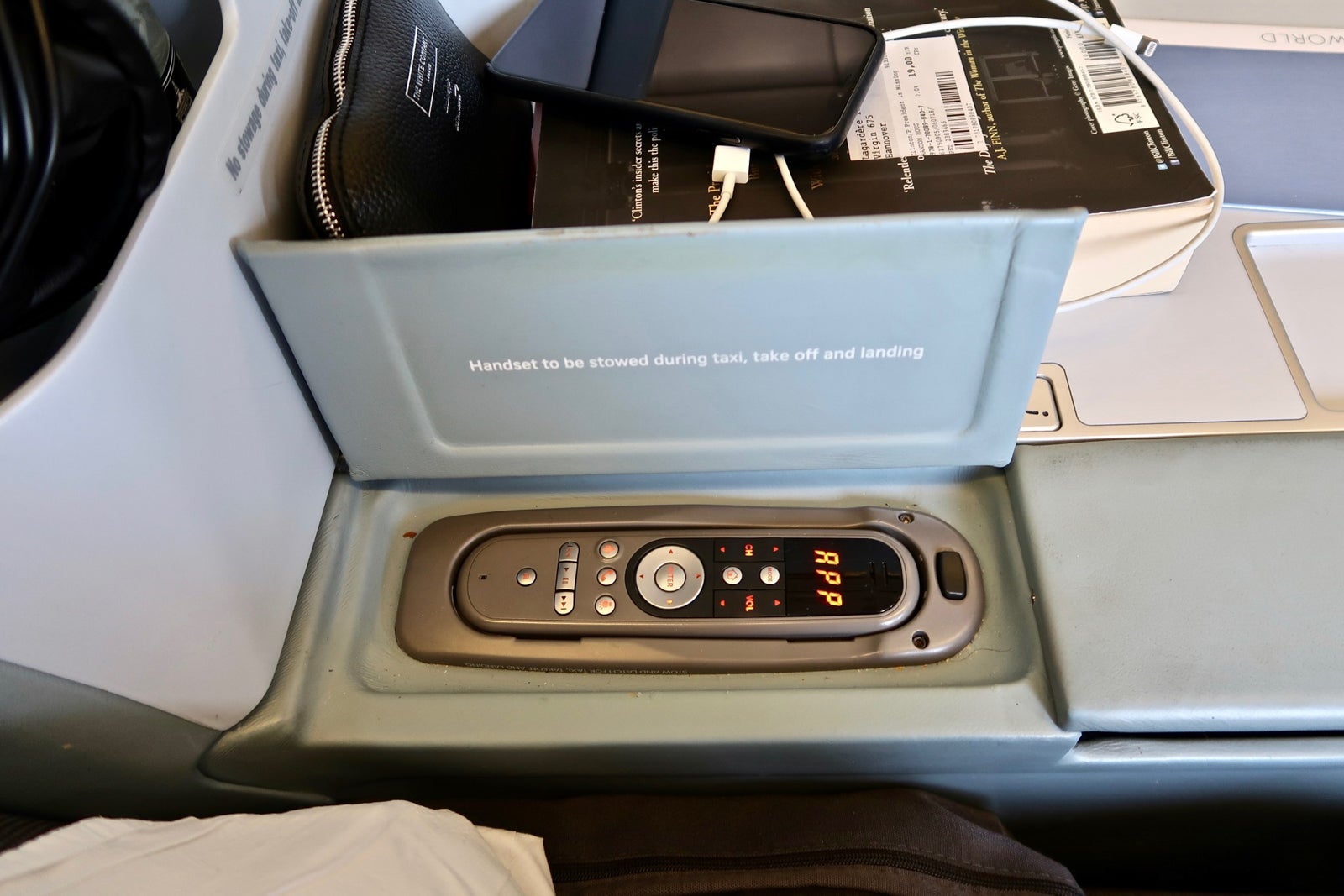The headphones were similar to BA's — not quite noise-canceling but decent. When I tried to watch a film after lunch, the sound was scratchy and unintelligible. A fresh set of headphones didn't help, and a crew member eventually apologized and explained that someone had reported that the system on my seat wasn't working properly on the previous night flight and that a maintenance crew had told the flight crew it had been fixed, which it clearly hadn't. The cabin crew said I could use an empty seat in the middle section of the row behind or (once they saw my face at the suggestion of leaving my single seat to join a child in the middle row) in a window seat at the back of the business-class cabin. Since I intended to work anyway before sleeping, it wasn't a big issue for me, but it would have been for someone else on a full flight.