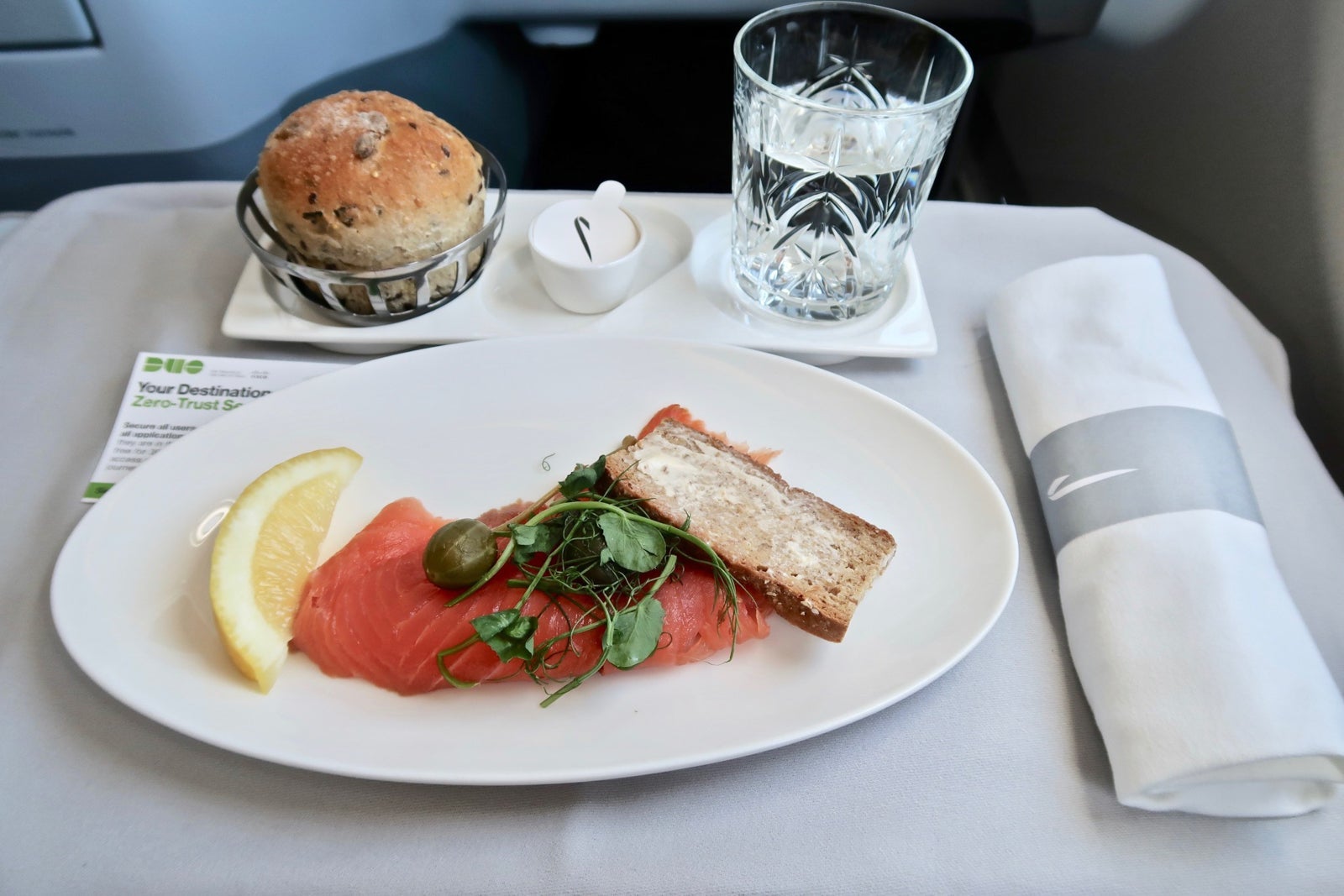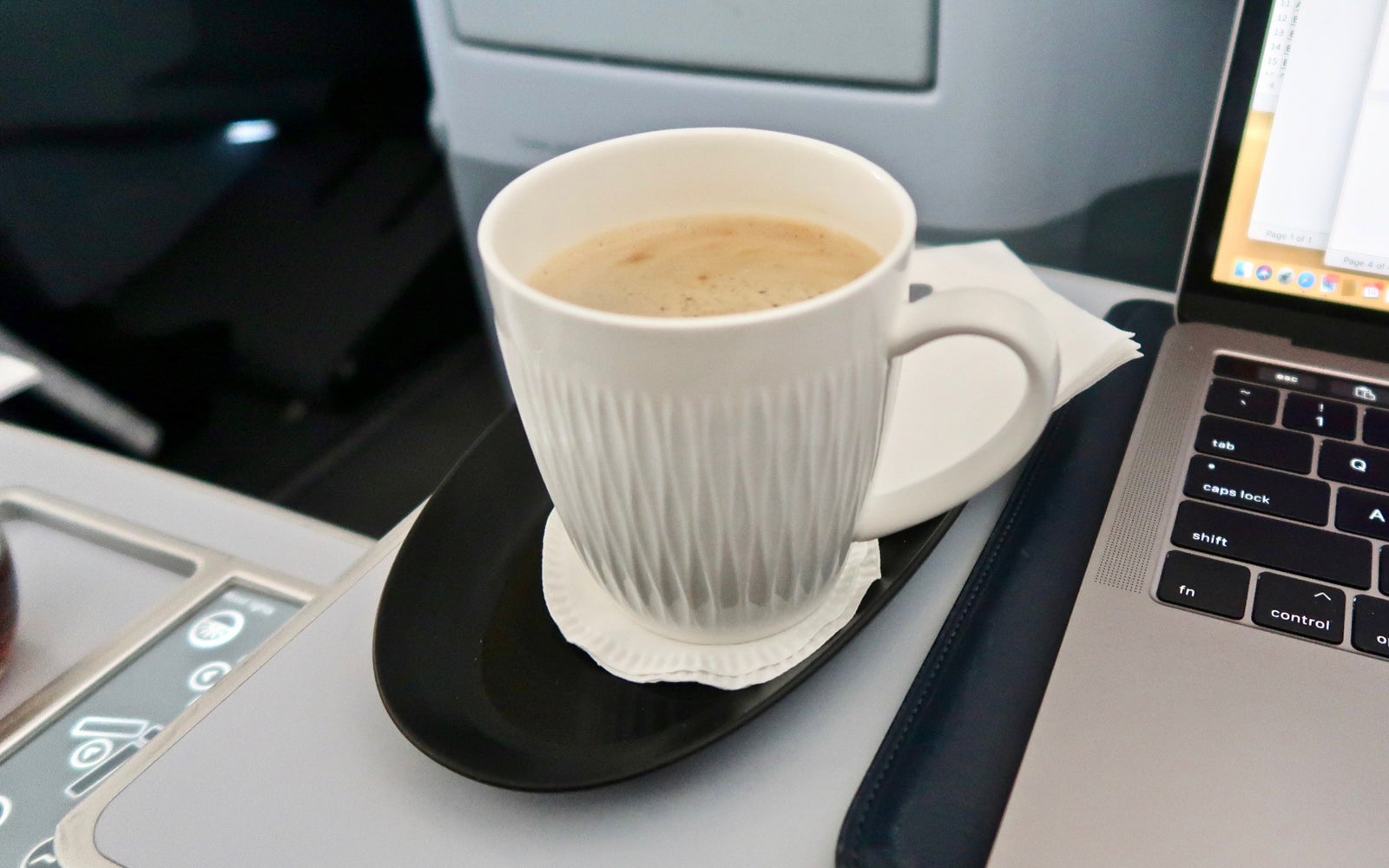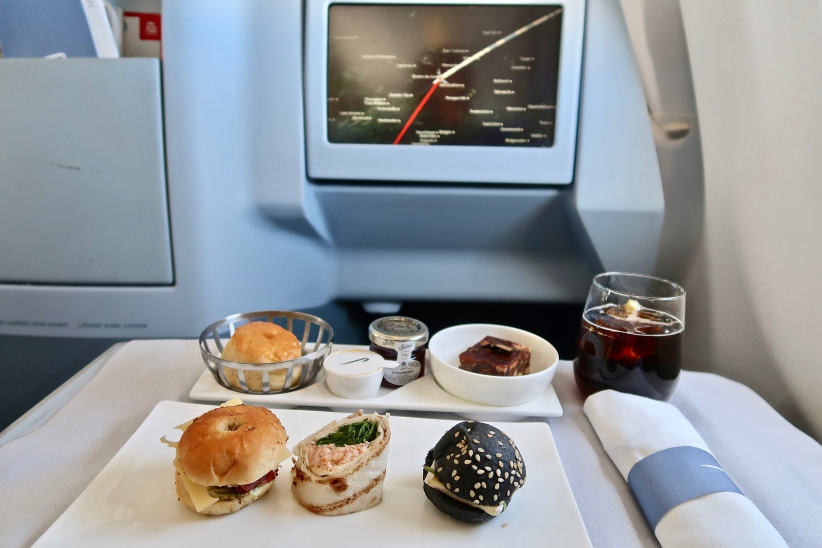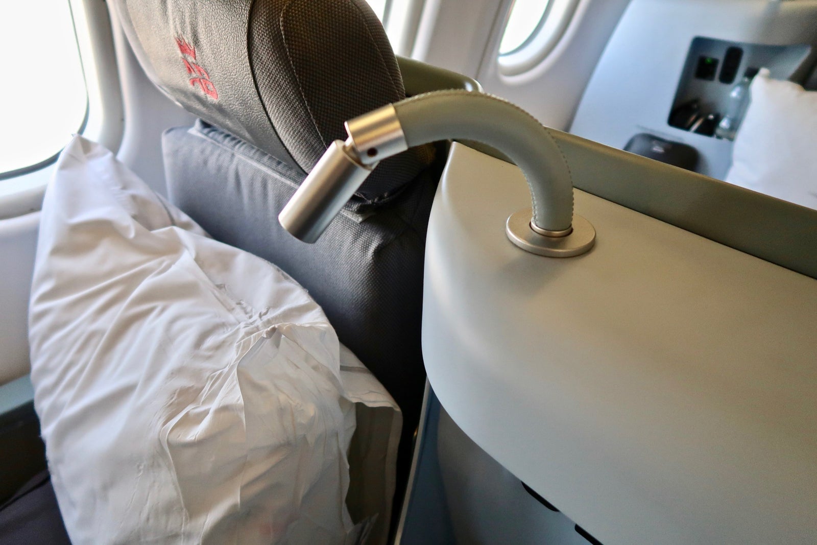 The headphones were similar to BA's — not quite noise-canceling but decent. When I tried to watch a film after lunch, the sound was scratchy and unintelligible. A fresh set of headphones didn't help, and a crew member eventually apologized and explained that someone had reported that the system on my seat wasn't working properly on the previous night flight and that a maintenance crew had told the flight crew it had been fixed, which it clearly hadn't. The cabin crew said I could use an empty seat in the middle section of the row behind or (once they saw my face at the suggestion of leaving my single seat to join a child in the middle row) in a window seat at the back of the business-class cabin. Since I intended to work anyway before sleeping, it wasn't a big issue for me, but it would have been for someone else on a full flight.