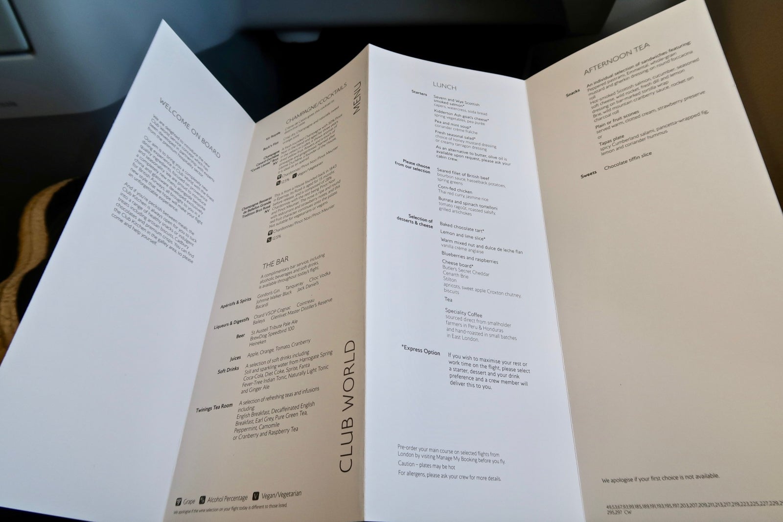 The normal BA Club World menus were on each seat upon boarding. Crew offered Champagne, water or juice after boarding and took orders for starters and main courses before takeoff.
