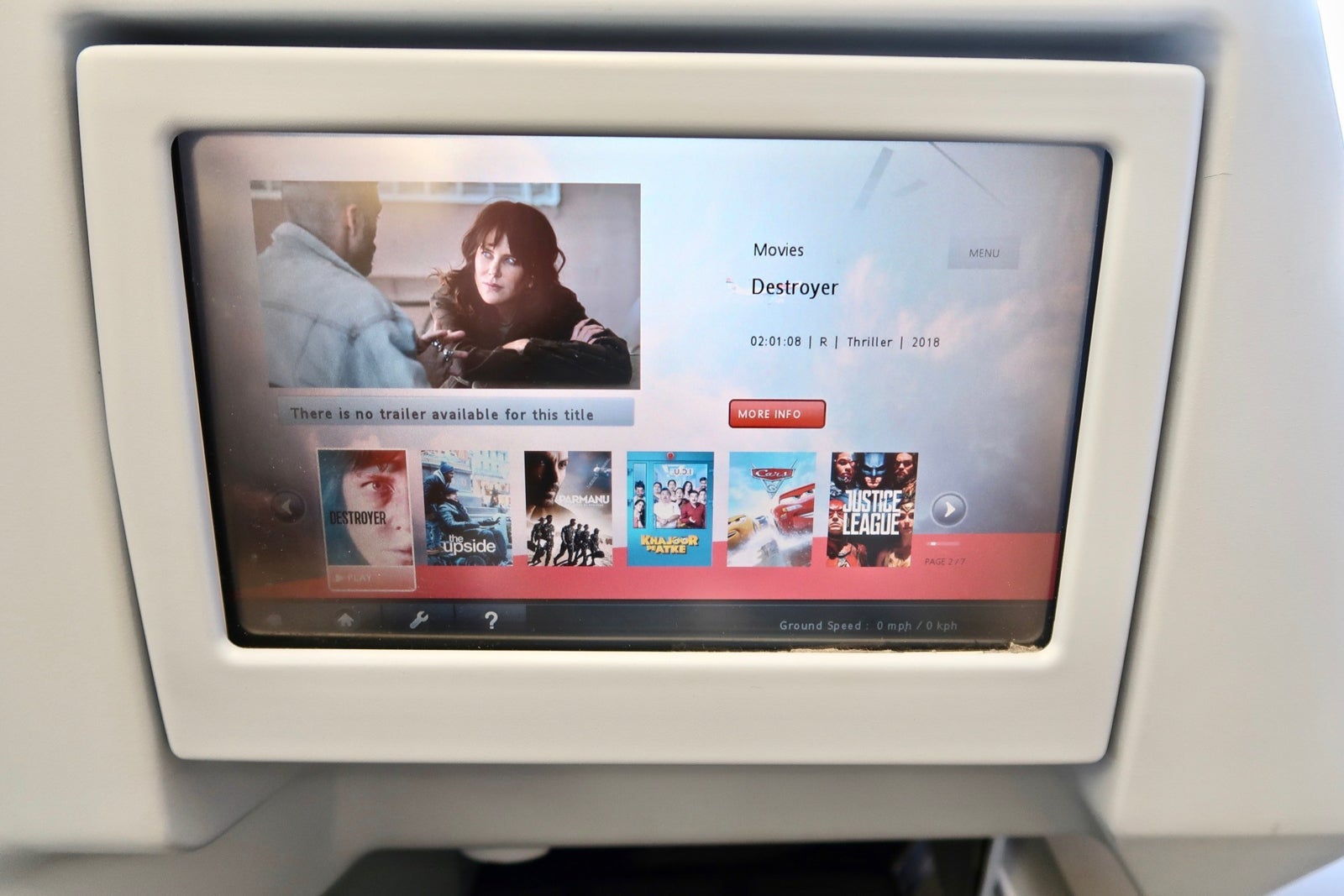 The IFE screen was old and quite small compared to most offerings. The entertainment was limited to movies, a standard moving map and a downward and forward camera. There were 41 movies, which in itself felt limited, given there were no TV shows or shorter programs. Most were recent releases (mostly 2018) and classics such as "Notting Hill" and "Love Actually."