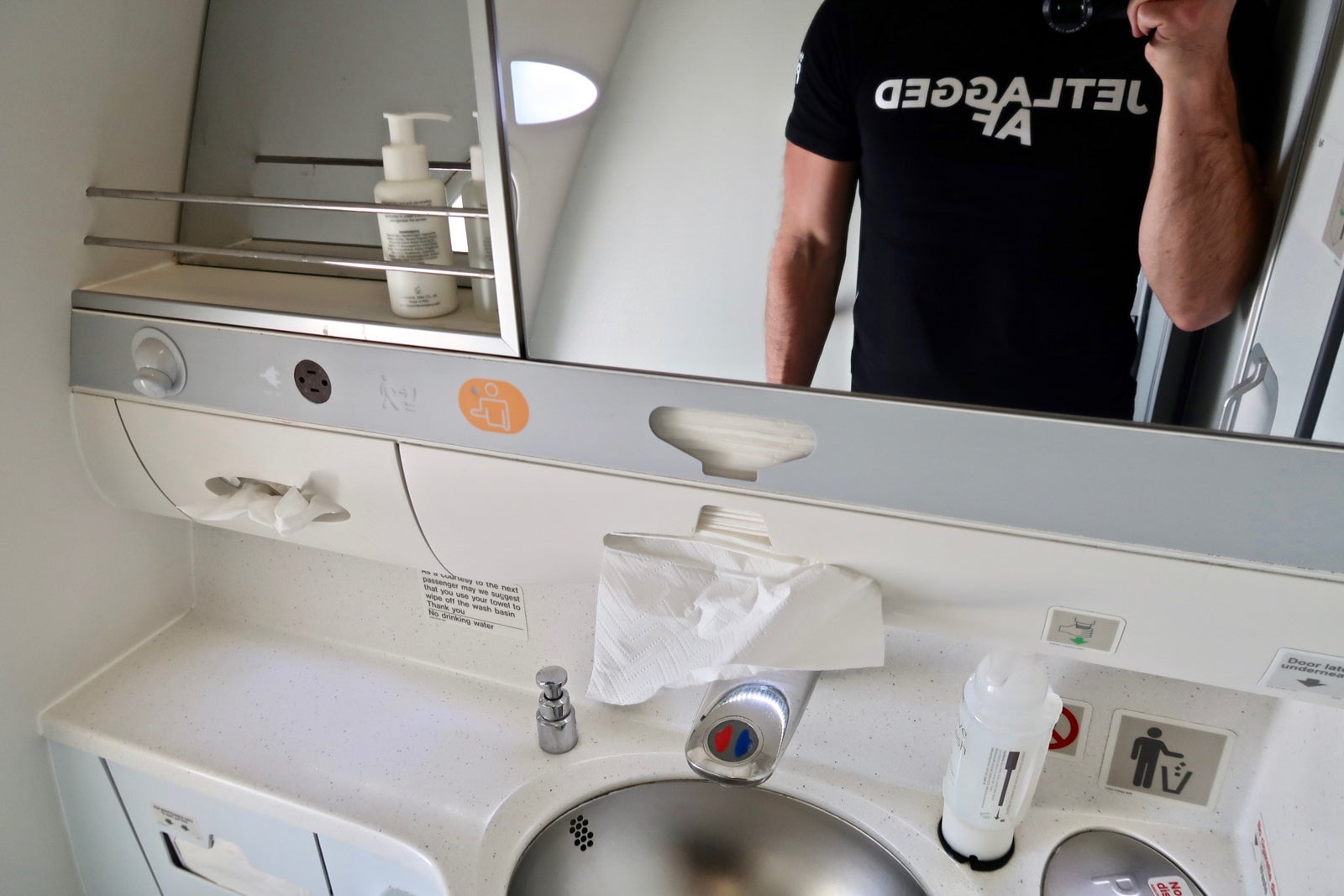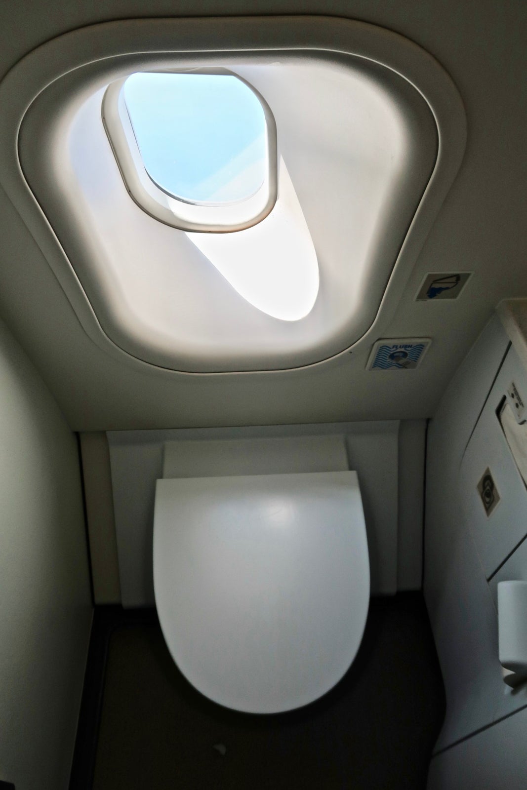 There were two lavs in the front galley as well as one in the middle galley, making a total of three for the 45 business-class passengers. The two in the front had a window, which made them light and bright — and who doesn't like a loo with a view?