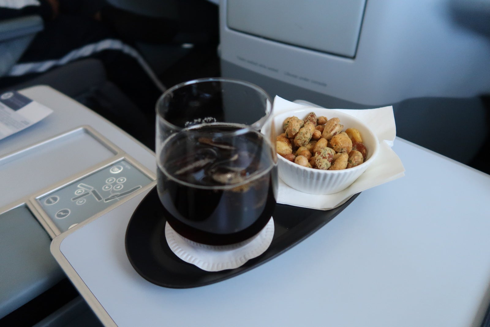 I was addressed by name when my drink order was taken shortly after takeoff, and drinks were served with coated nuts.