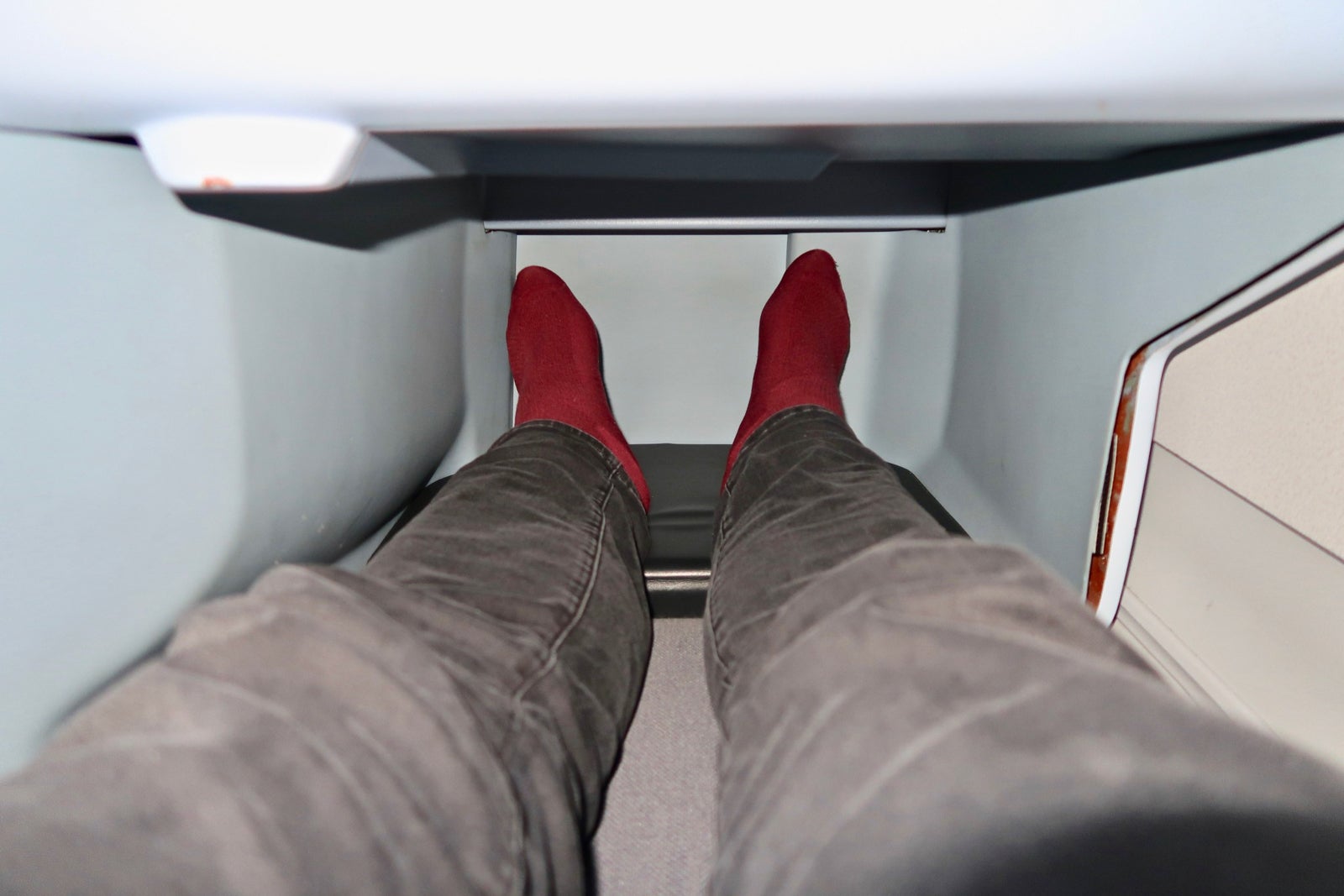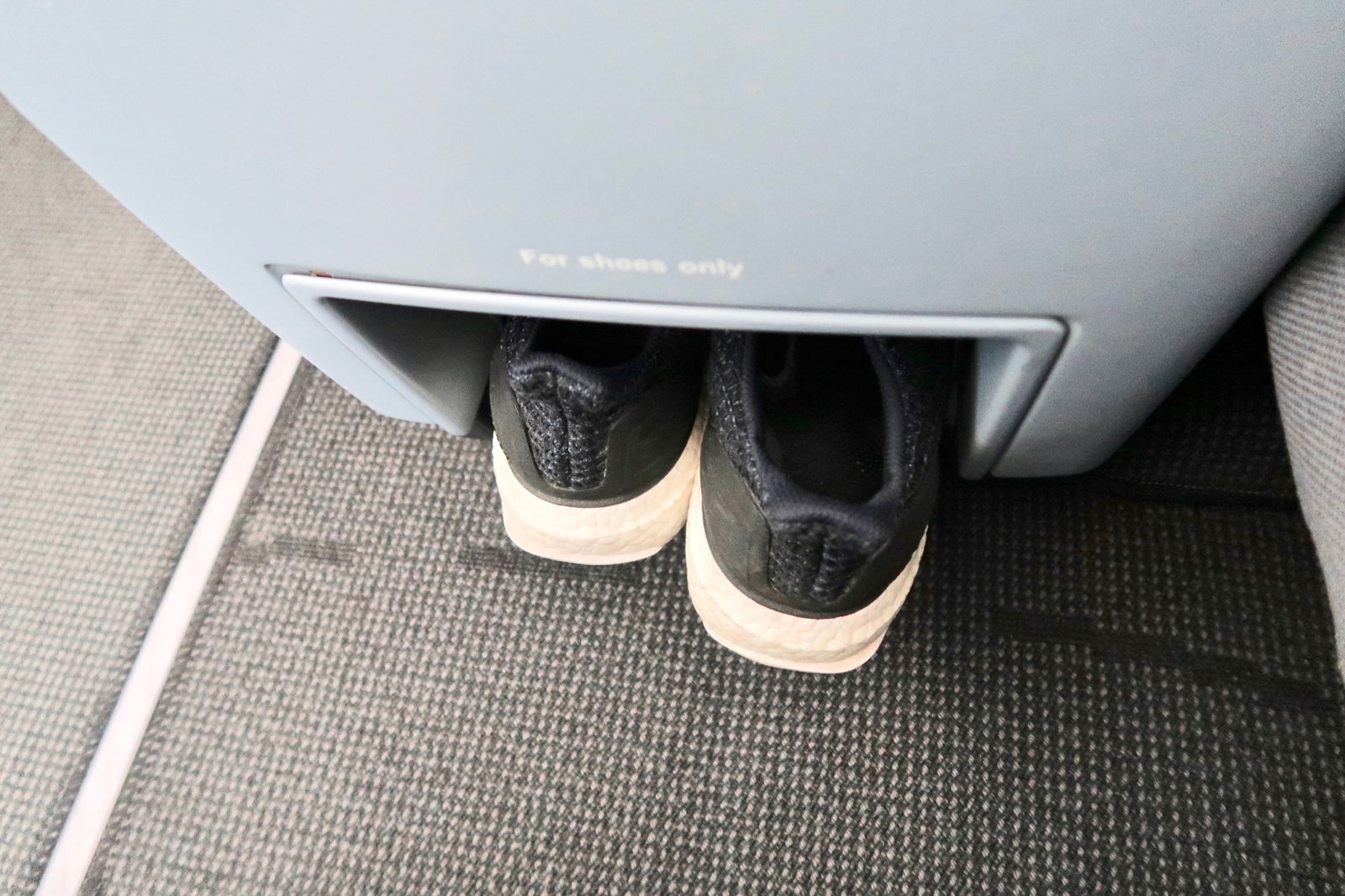 The footwell was enclosed and under the side table of the seat in front, and there was a little storage space for shoes.
