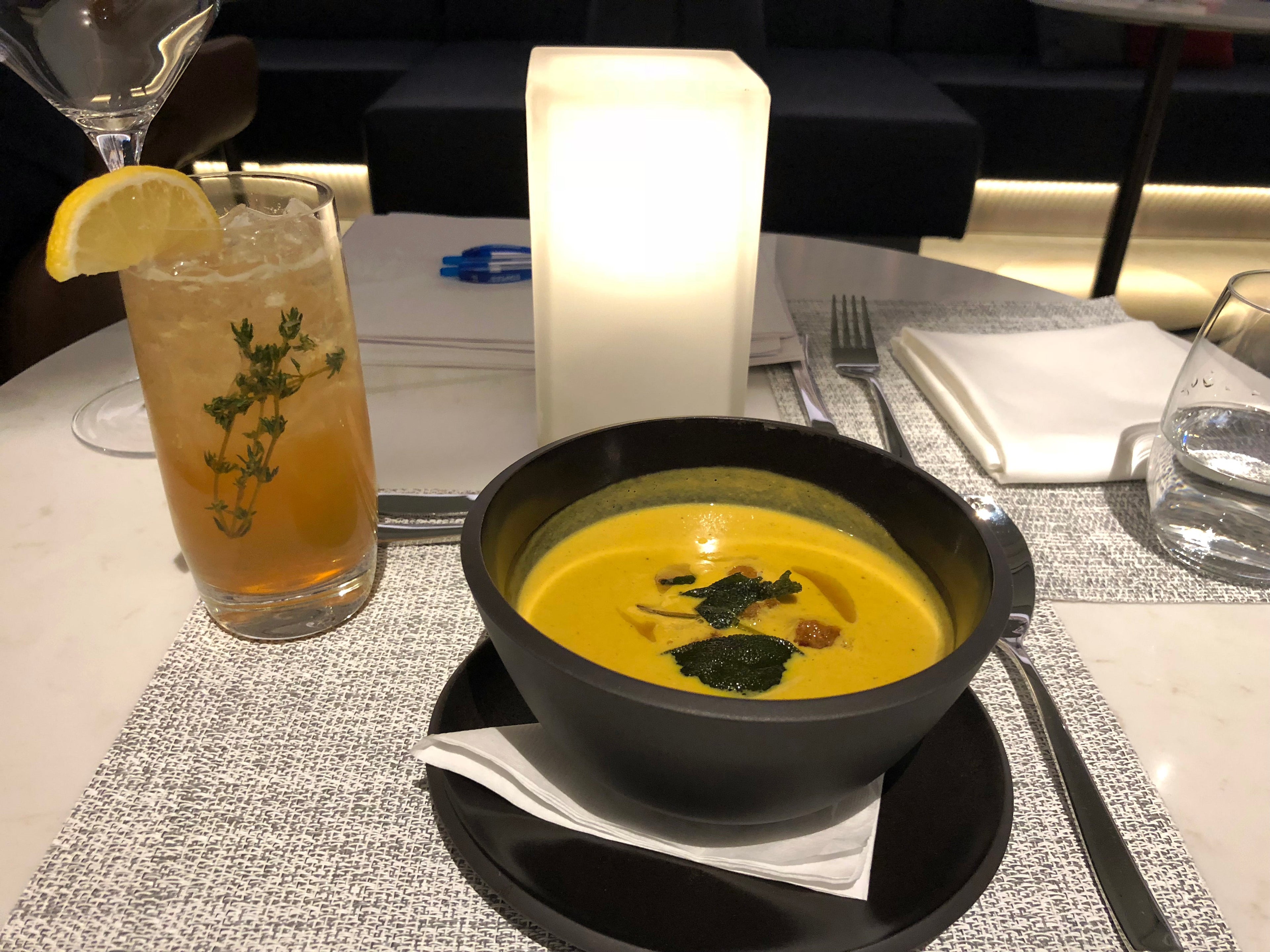 I opted to try a couple of options from the à la carte menu. For an appetizer I chose the roasted pumpkin soup, which was served with crisp sage and brown butter croutons. The soup was amazing — the best pumpkin soup I've ever had.