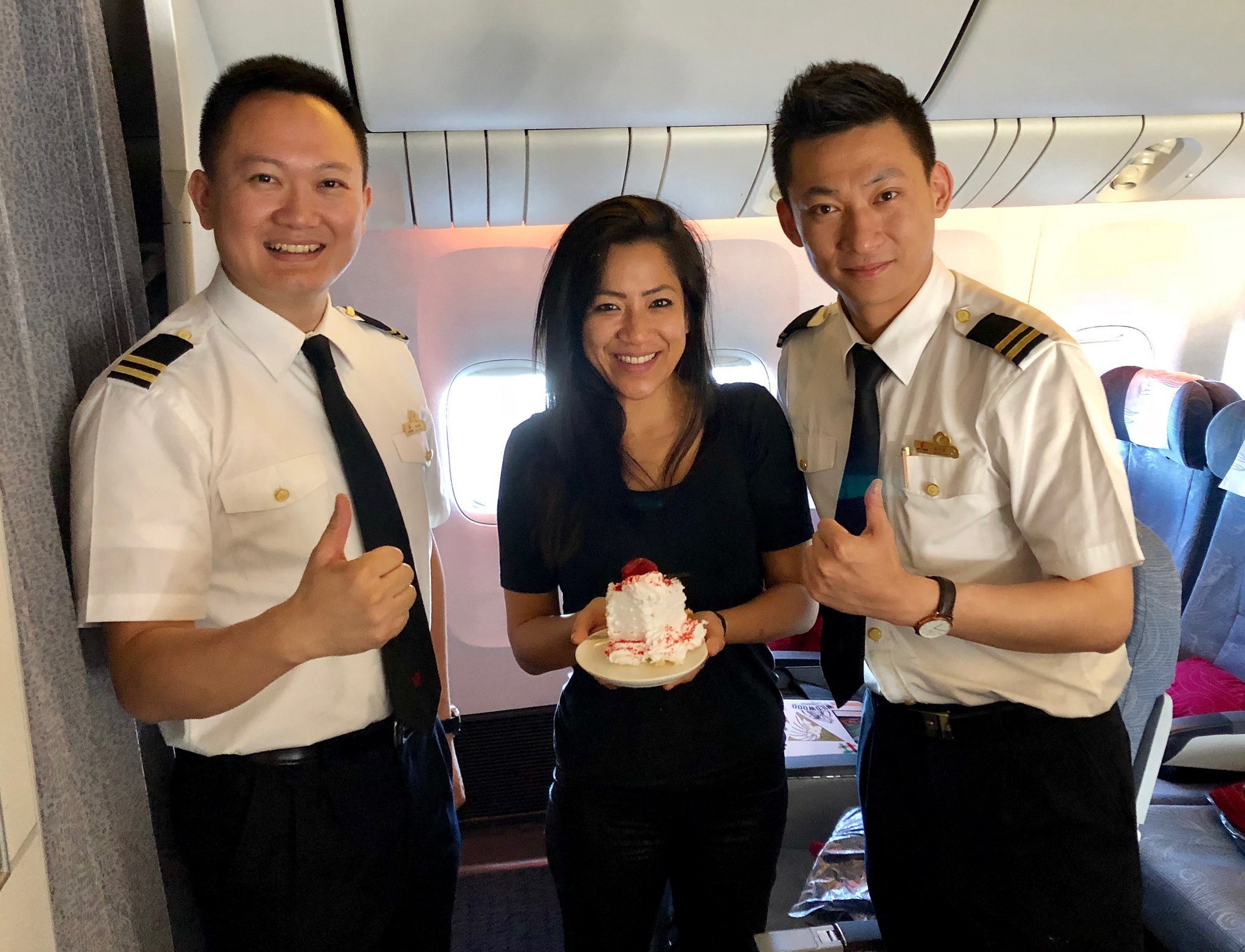 Then I was urged by all three men to stand up for a photo with the flight attendants "to help commemorate this auspicious occasion." Yes, the seat-belt sign was off.
