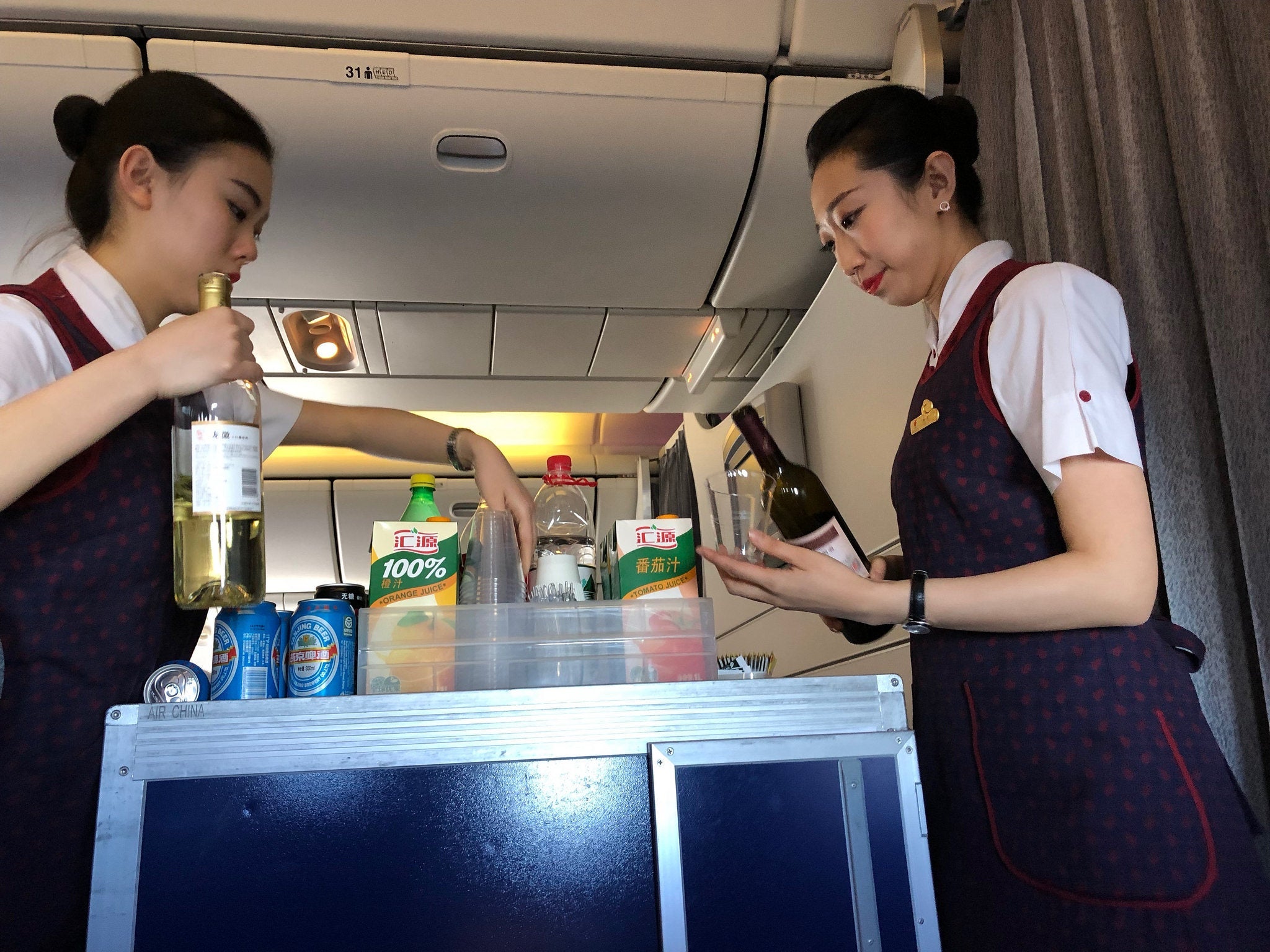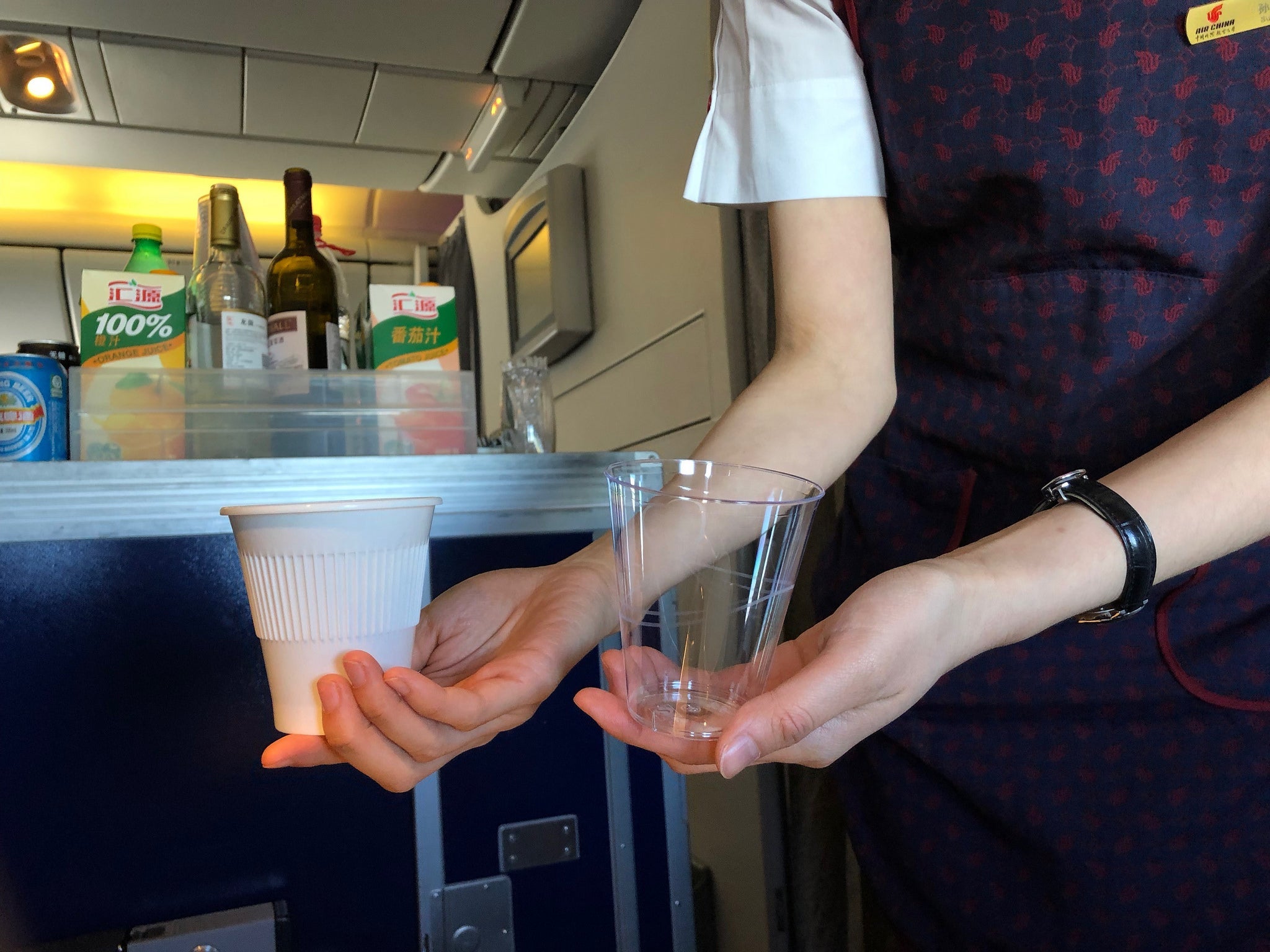 She also took a moment to demonstrate to me the difference between the two types of plastic cups offered onboard Air China CA 886. The white plastic cup is for the elderly and for children, because it's more flexible and heat-resistant; the clear cup is more elegant for that higher-class experience. I found this to be a very heartwarming explanation.