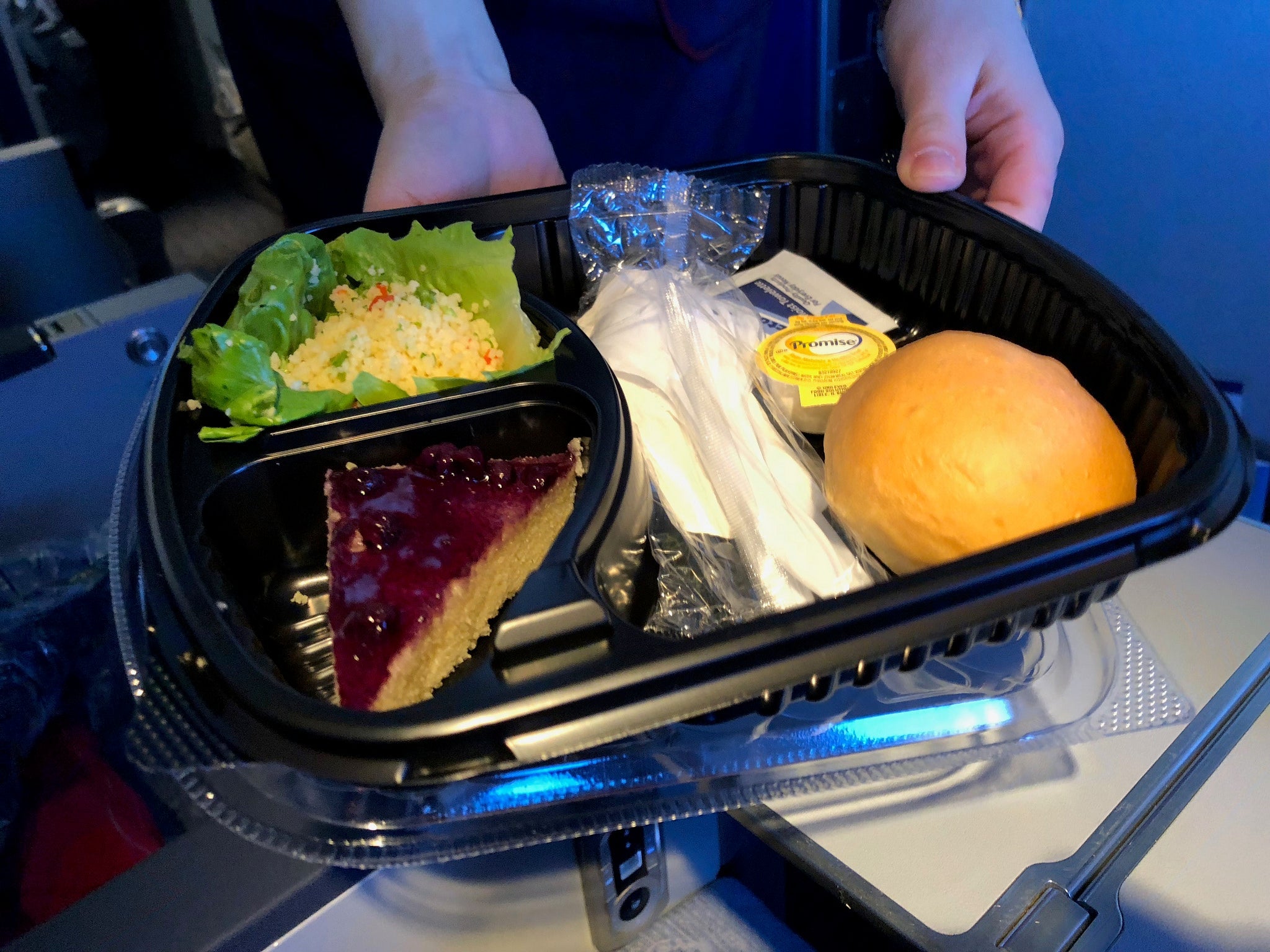 Dinner was served almost immediately after drink service. I was served bento box appetizer featuring blueberry cake, quinoa, and a roll. I was told it was a specialty for the inaugural flight, so I'm not sure what will be served in its place on future flights. I would give the quinoa a 6/10 rating, and the blueberry cake a 4/10 rating. The roll was an 8/10 when adjusted for airplane quality — a 4/10 without the curve.