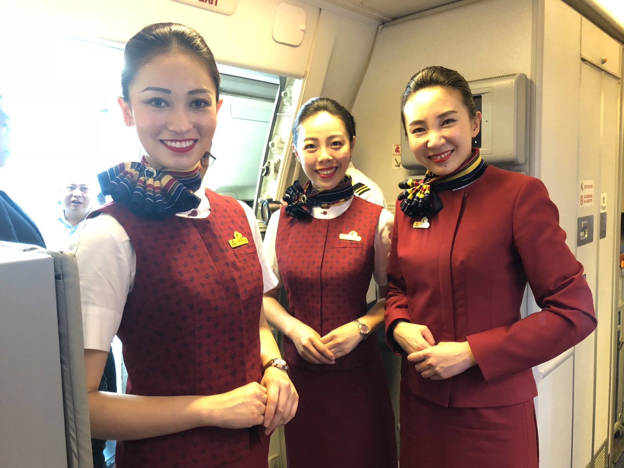 The flight was very empty, so I asked the flight attendant if I could switch to a window seat. She enthusiastically asked me to seat myself wherever I wanted, saying in Chinese, "Because you support us [for having been on both of our inaugural flights], we support you!" I found this very endearing.